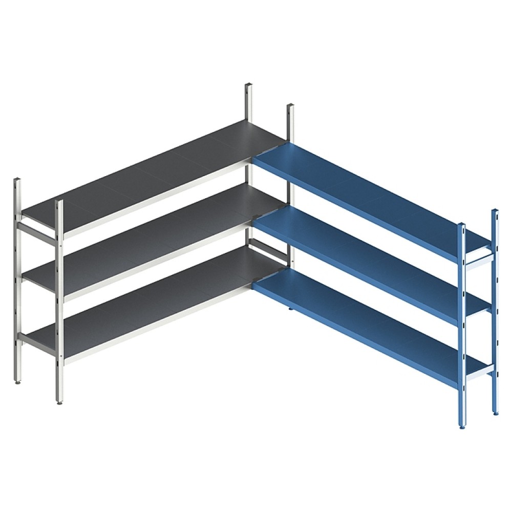 Модель представляет собой дополнительную угловую секцию модульной стеллажной системы и может стыковаться в линию с базовой и дополнительной линейной секциями.