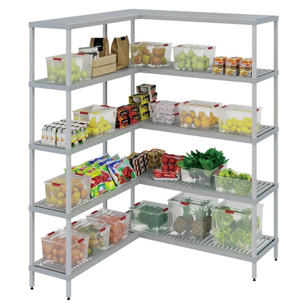 Модель представляет собой дополнительную угловую секцию модульной стеллажной системы и может стыковаться в линию с базовой и дополнительной линейной секциями.