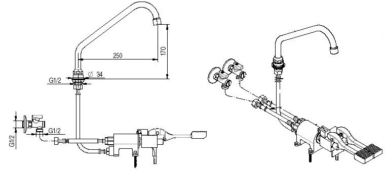 Смеситель педальный горизонтальный Monolith R 0902020204 предназначен для ежедневного использования и подачи воды на кухнях в пекарнях, столовых, кафе, ресторанах и на других предприятиях общественного питания. Модель оснащена 2 педалями.