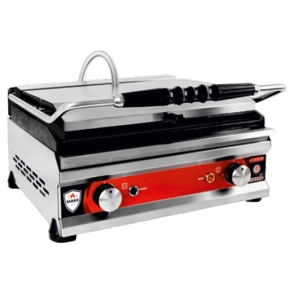 Электрический контактный гриль Yukon Eco Star MTS-12 предназначен для жарки мяса, птицы, рыбы, овощей, а также для приготовления стейков, гамбургеров и горячих сэндвичей на предприятиях пищевой промышленности, общественного питания и торговли. Модель оснащена откидной крышкой с основной горизонтальной рукояткой с рельефной накладкой, малой вспомогательной рукояткой, устойчивыми нескользящими опорами и электромеханической панелью управления. Корпус выполнен из нержавеющей стали, накладки на рукоятках – из термостойкого пластика.