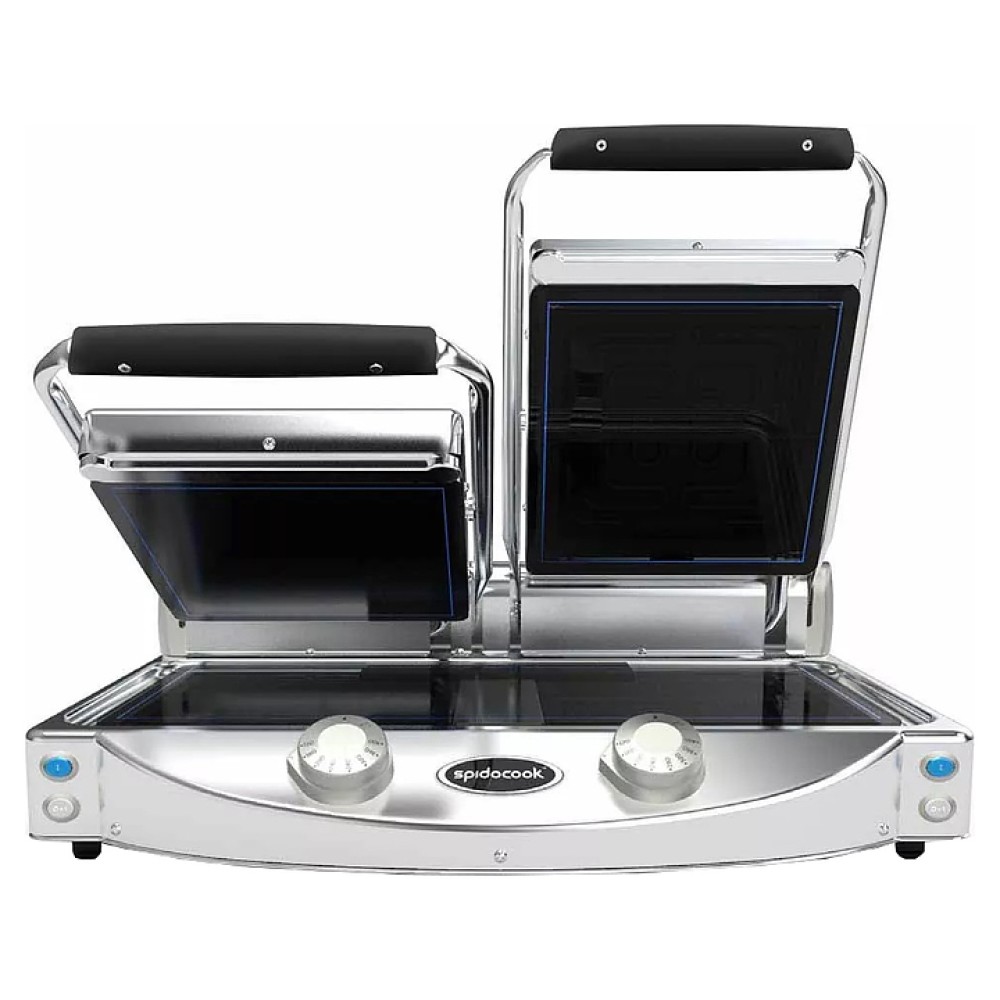 Контактный гриль Spidocook Spidoglass SP020P предназначен для жарки, быстрого приготовления и разогрева блюд из мяса, рыбы, птицы и полуфабрикатов в отелях, аэропортах, фуд-траках и на других предприятиях общественного питания и торговли. Модель оснащена электромеханической панелью управления с кнопкой включения / выключения и светодиодным индикатором, съемным поддоном для сбора жира, эргономичной ручкой и 4 нескользящими ножками. Корпус выполнен из нержавеющей стали. Рабочая поверхность имеет антипригарное покрытие, не впитывает запахи и отличается высокой ударопрочностью.