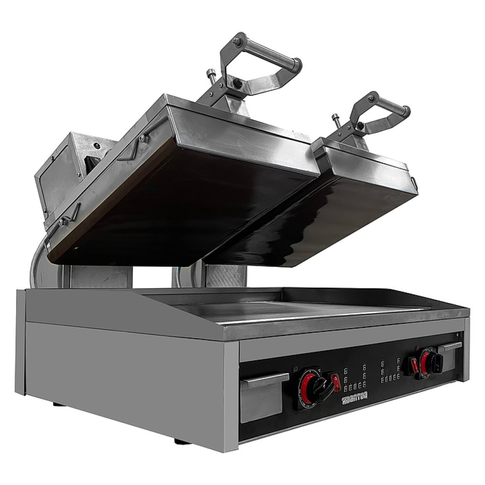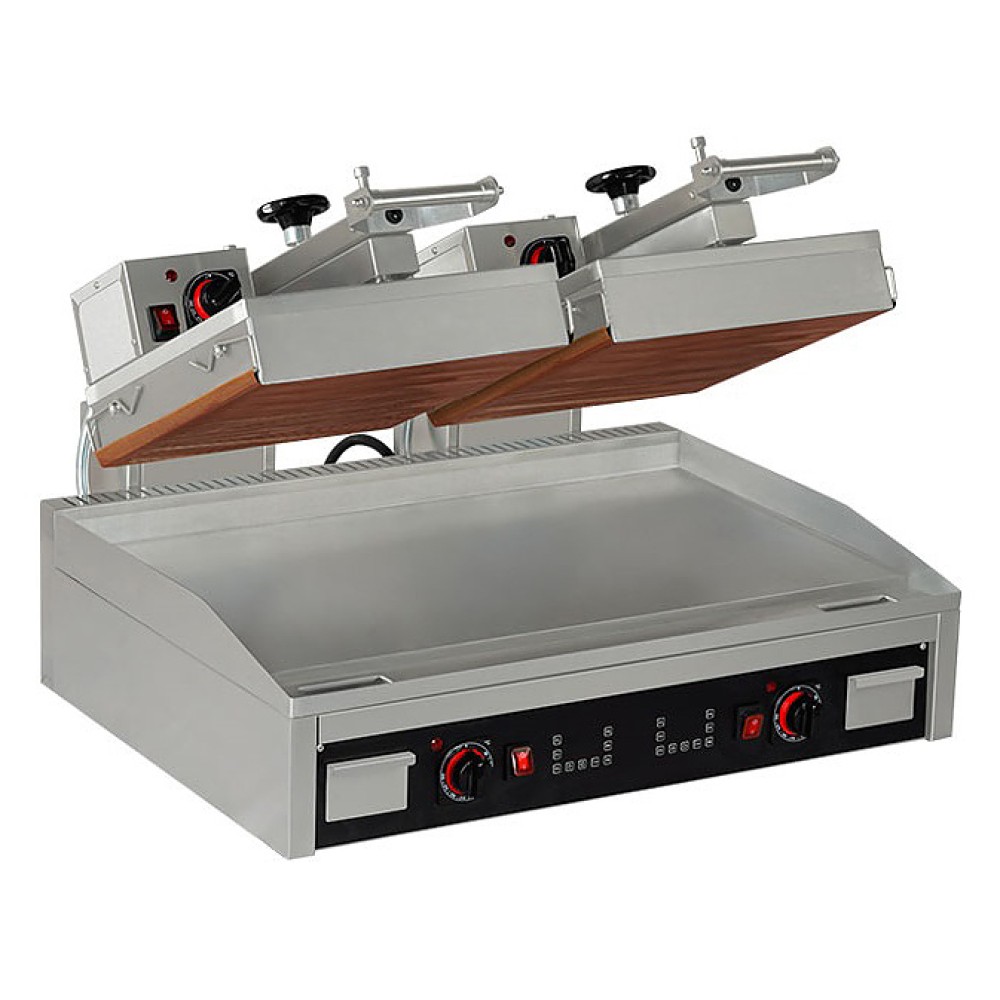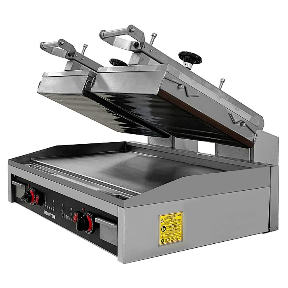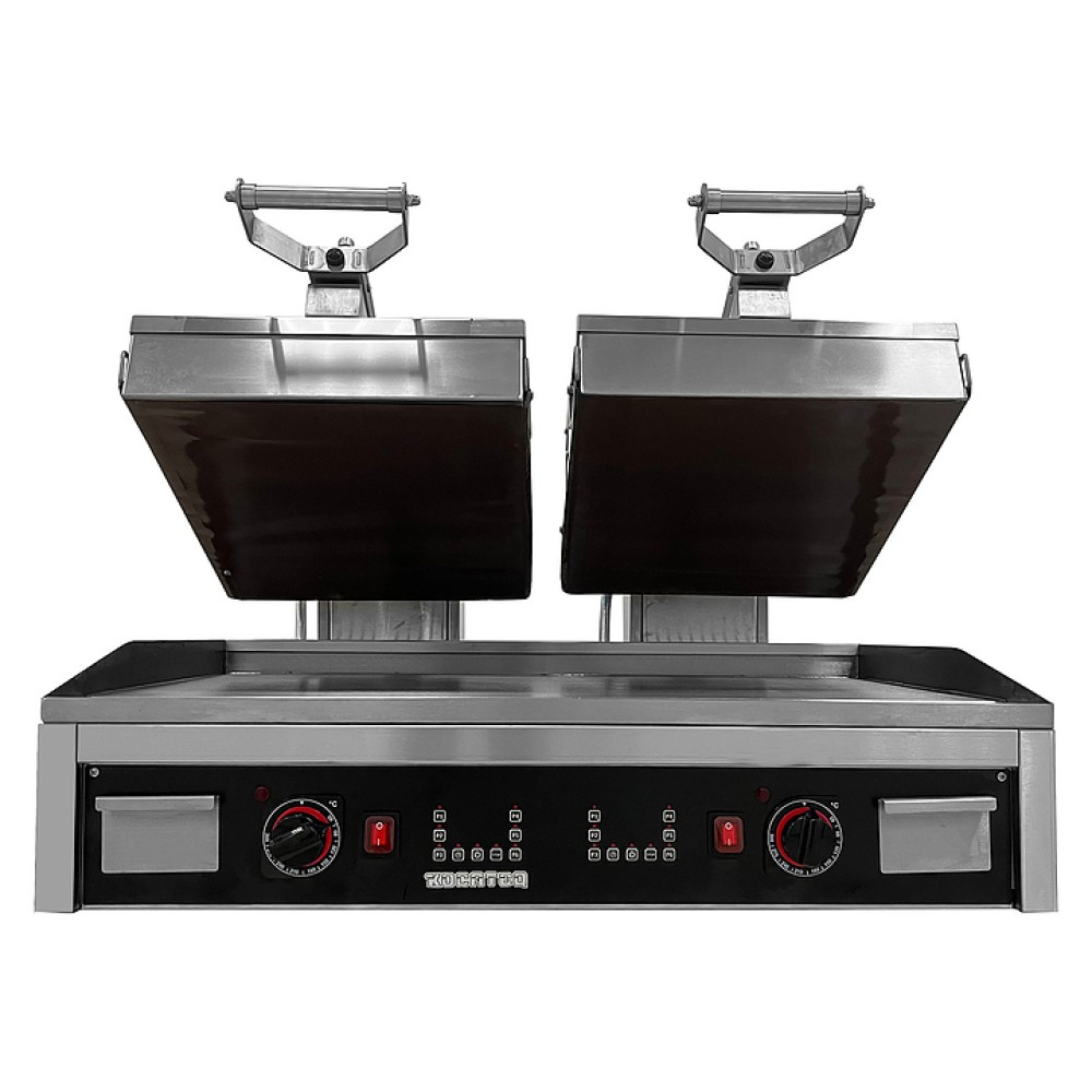 Гриль пресс Kocateq GH66ED класса heavy-duty предназначен для жарки стейков мяса, птицы, рыбы и овощей, приготовления стейков, гамбургеров и горячих сэндвичей на предприятий fast-food, общественного питания и торговли. Модель оснащена цифровой панелью управления и термостатами для регулировки температуры. Верхние пластины покрыты сменной тефлонированной стеклотканью, нижняя пластина - из теплопроводящего сплава, корпус - из нержавеющей стали, ножки - из пластика.