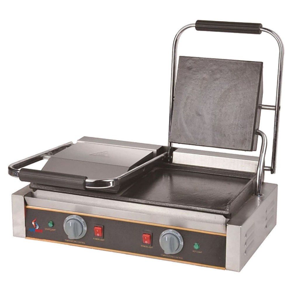 Прижимной гриль Airhot DCG-FF предназначен для жарки мяса, птицы, рыбы, овощей, а также для приготовления стейков, гамбургеров и горячих сэндвичей на предприятиях общественного питания и торговли. Высокая скорость приготовления достигается благодаря встроенным в обе части аппарата тепловым элементам, которые плотно прилегают к продукту. Модель оснащена терморегулятором и съёмным поддоном для сбора жира и крошек. Корпус выполнен из нержавеющей стали, жарочная поверхность - из чугуна с антипригарным покрытием.