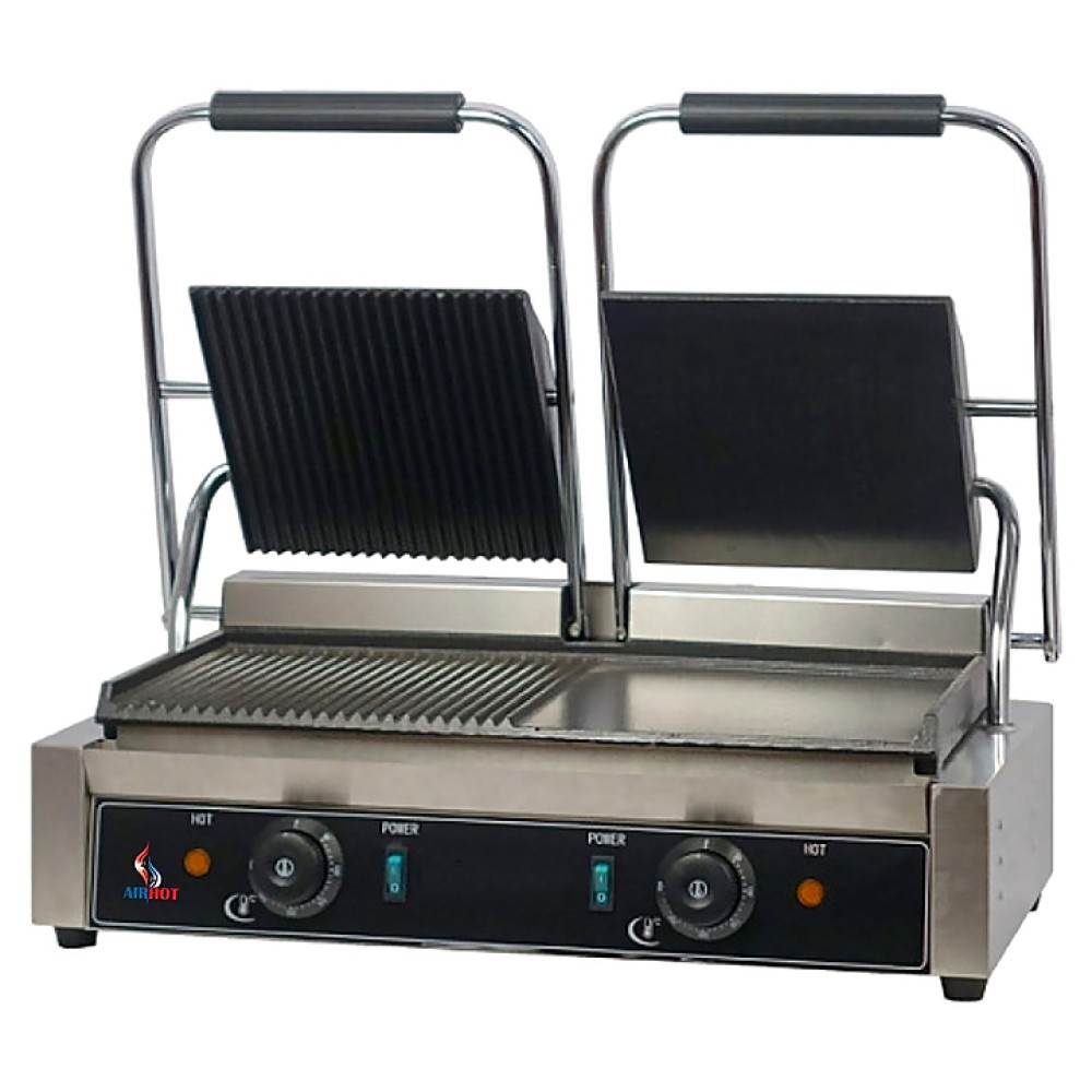 Прижимной гриль Airhot DCG-FFG предназначен для жарки мяса, птицы, рыбы, овощей, а также для приготовления стейков, гамбургеров и горячих сэндвичей на предприятиях общественного питания и торговли. Высокая скорость приготовления достигается благодаря встроенным в обе части аппарата тепловым элементам, которые плотно прилегают к продукту. Модель оснащена терморегулятором и съёмным поддоном для сбора жира и крошек. Корпус выполнен из нержавеющей стали, жарочная поверхность - из чугуна с антипригарным покрытием.