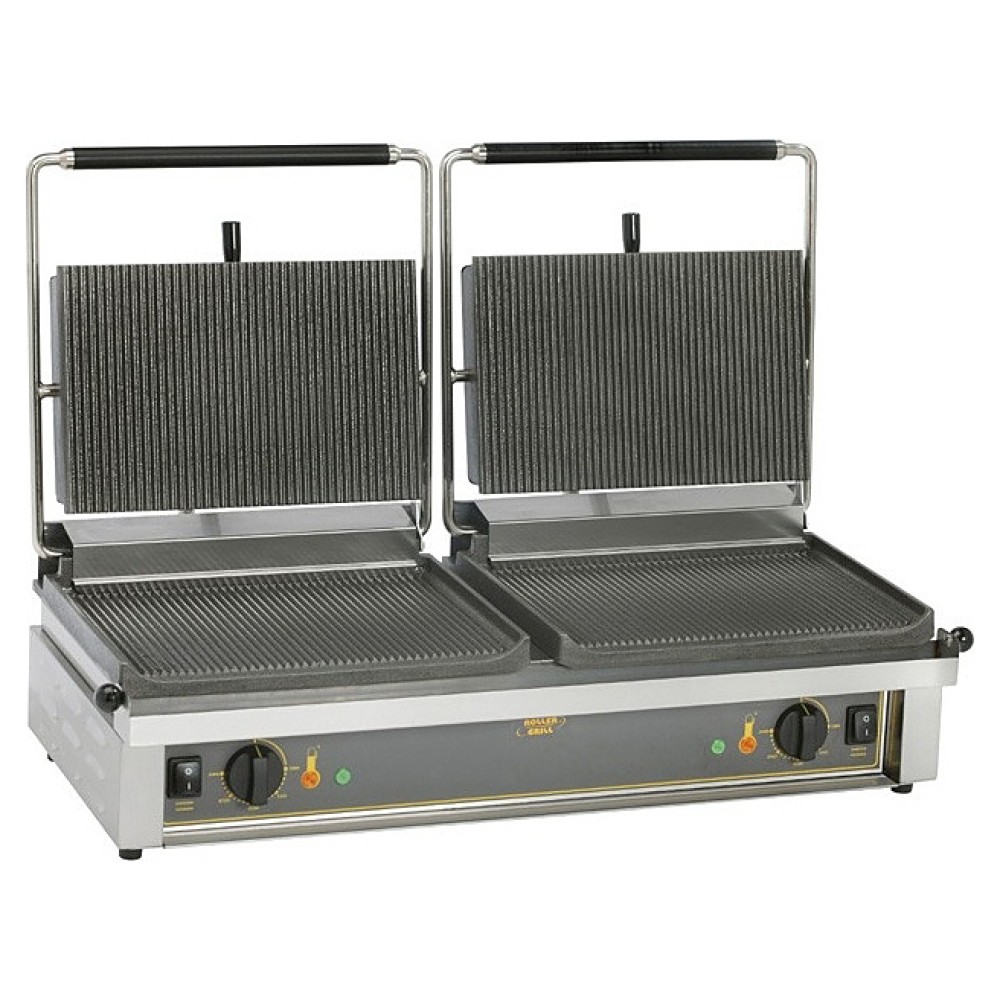 Прижимной гриль Roller Grill Double Panini R предназначен для жарки мяса, птицы, рыбы, овощей, а также для приготовления стейков, гамбургеров и горячих сэндвичей на предприятиях общественного питания и торговли. Модель оснащена поддоном для сбора соков и лишнего жира. Корпус выполнен из нержавеющей стали, ручки - из термостойкого материала.