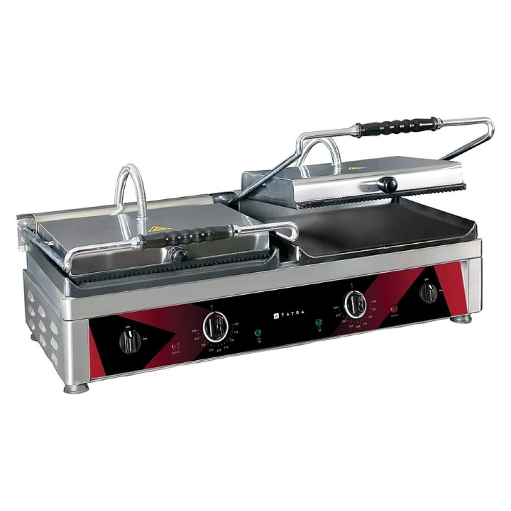 Прижимной гриль Tatra TCG 3627 RS RS предназначен для жарки мяса, птицы, рыбы, овощей и быстрого разогрева полуфабрикатов на предприятиях общественного питания и торговли. Модель оснащена электромеханической панелью управления с терморегулятором и индикаторами питания и нагрева, системой независимого управления каждой зоной нагрева, 2 раздельными верхними и нижними поверхностями и емкостью для сбора жира. Корпус выполнен из нержавеющей стали.
