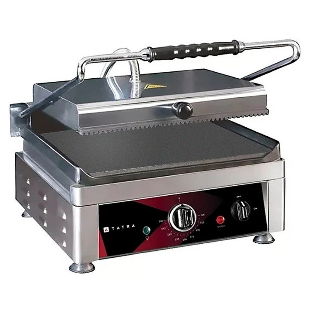 Прижимной гриль Tatra TCG 4527 RS предназначен для жарки мяса, птицы, рыбы, овощей и быстрого разогрева полуфабрикатов на предприятиях общественного питания и торговли. Модель оснащена электромеханической панелью управления с терморегулятором и индикаторами питания и нагрева и емкостью для сбора жира. Корпус выполнен из нержавеющей стали.