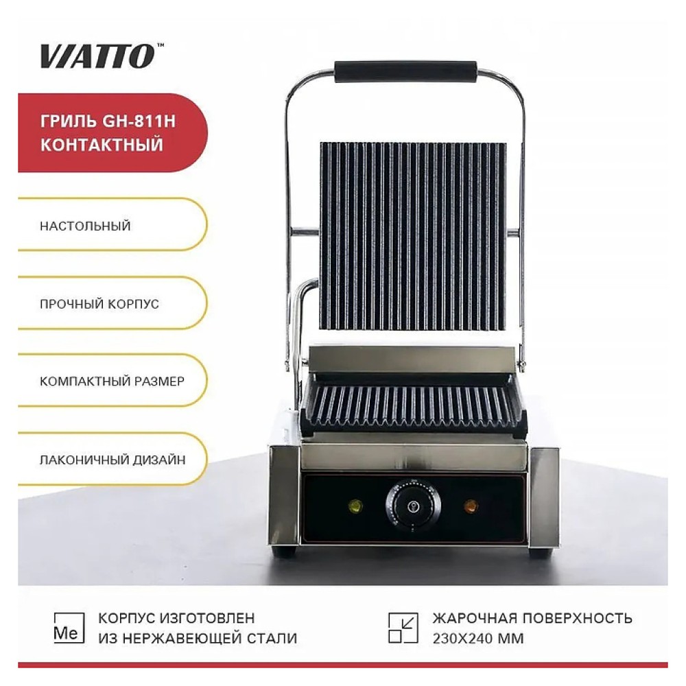 Прижимной гриль VIATTO GH-811H предназначен для жарки мяса, птицы, рыбы, овощей и быстрого разогрева полуфабрикатов на предприятиях общественного питания и торговли. Рабочие поверхности имеют антипригарное покрытие.