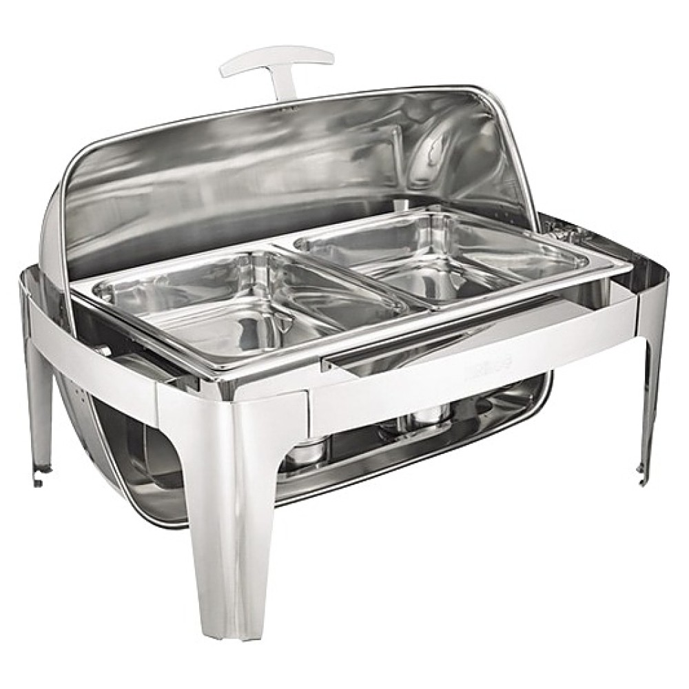 Чафинг-диш MVQ 32217 используется на предприятиях общественного питания и торговли, в частных домах и квартирах для поддержания в горячем состоянии готовых блюд. Модель оснащена 2 гастроемкостями и откатной крышкой с ручкой. Изделие выполнено из высококачественной нержавеющей стали, которая легко моется и не впитывает запахов.