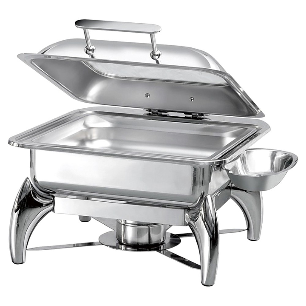 Чафинг-диш MVQ AT62293 используется на предприятиях общественного питания и торговли, в частных домах и квартирах для поддержания в горячем состоянии готовых блюд. Модель оснащена стеклянной крышкой, держателем для столовых приборов и горелкой для горючего геля или сухого спирта. Изделие выполнено из высококачественной нержавеющей стали, которая легко моется и не впитывает запахов.