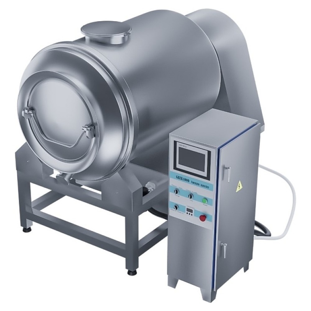 Вакуумный массажер Hualian GRZK1000 используется на предприятиях общественного питания и торговли для массирования мяса, рыбы или птицы в процессе маринования и посола. Модель оснащена современным PLC-контроллером, регулируемой скоростью вращения барабана и сенсорной панелью управления. Массажер выполнен из высококачественной пищевой нержавеющей стали.
