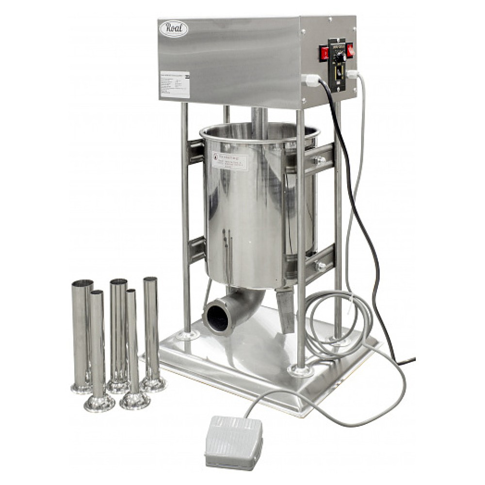 Колбасный шприц Roal Meat DD10L используется на предприятиях общественного питания и торговли для изготовления колбас, сосисок и сарделек, а также набивки паштетов, творожных масс и других плотных вязких продуктов. Модель оснащена ножной педалью. Корпус выполнен из пищевой нержавеющей стали AISI 304.