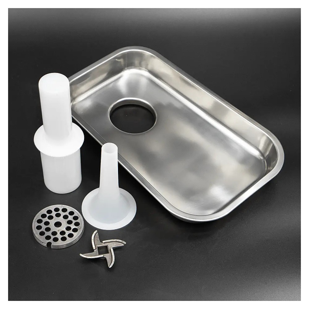 В комплект поставки входят 2 крестообразных ножа и 2 решетки (6 и 8 мм).