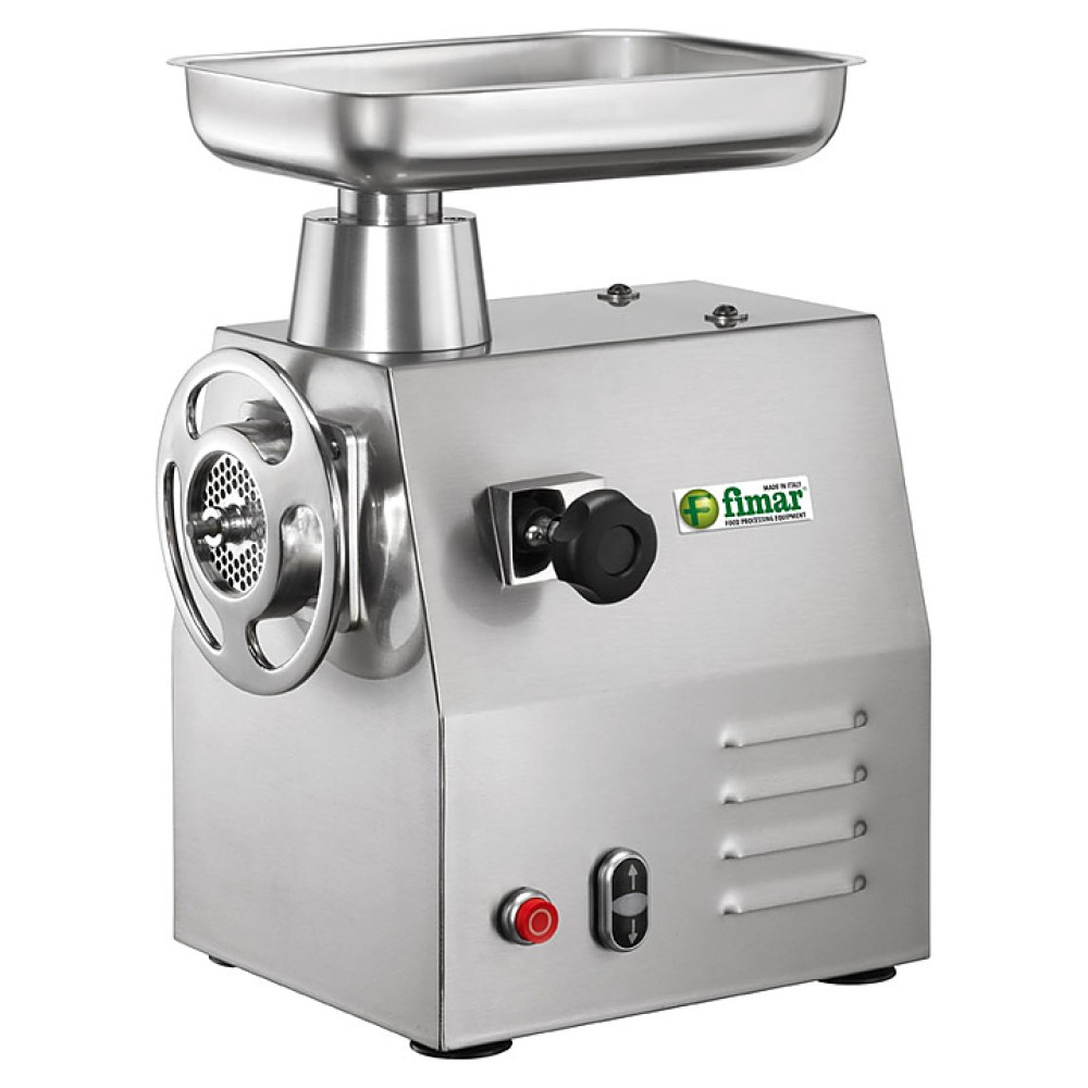 Мясорубка FIMAR 22/RS предназначена для измельчения мяса и рыбы на фарш, повторного измельчения котлетной массы и набивки колбас на предприятиях общественного питания и торговли. Модель оснащена режущей системой полный унгер, зубчатым редуктором в масляной ванне и реверсом. Корпус, ножи, решетки, бункер и режущий узел выполнены из нержавеющей стали.