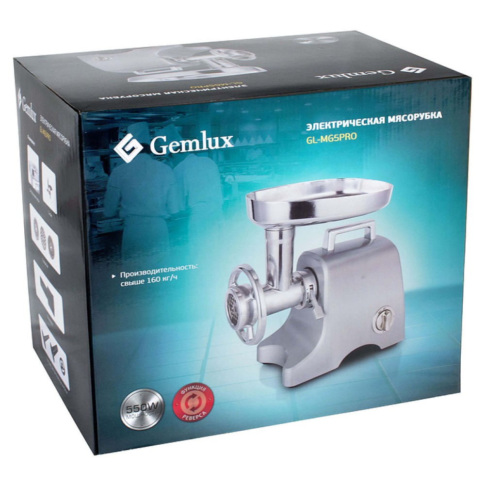Мясорубка Gemlux GL-MG5PRO используется на предприятиях общественного питания и торговли для приготовления мясного и рыбного фарша и колбасных изделий. Модель оснащена загрузочным лотком и функцией реверса, которая позволяет в случае блокировки шнека продуктом освободить его без необходимости разбирать и очищать прибор. Корпус выполнен из алюминия, кованый нож и решетки - из нержавеющей стали.