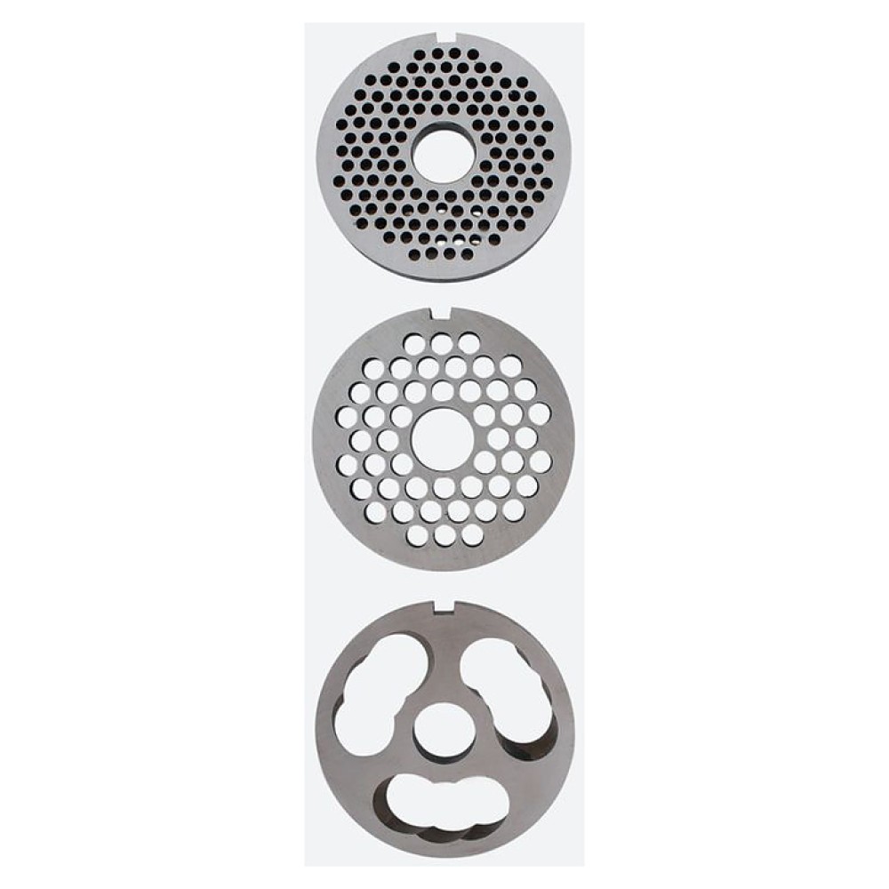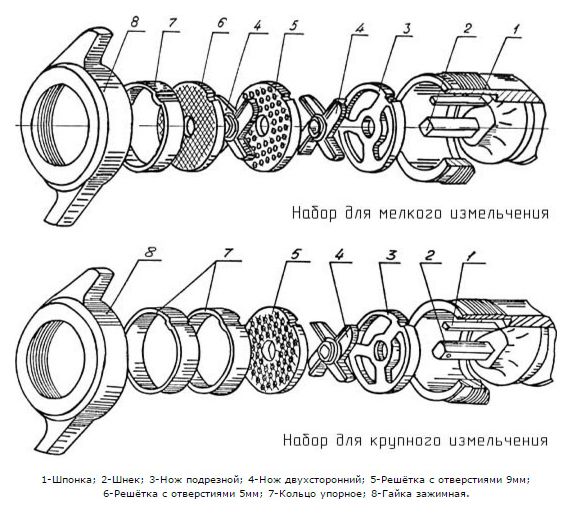 В комплект поставки входят нож подрезной, 2 двусторонних ножа, 2 решетки с отверстиями (№2 и № 3), насадка для набивки колбас и толкатель.