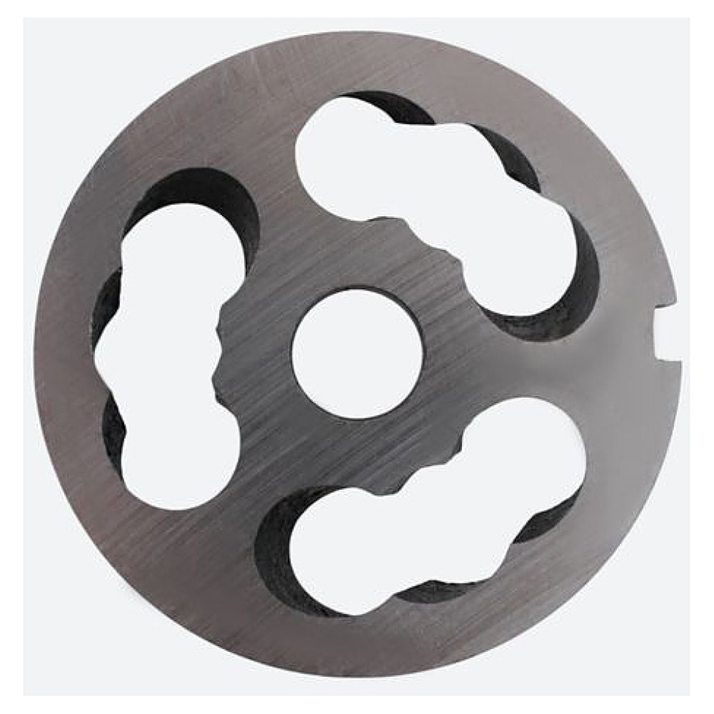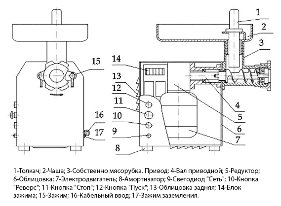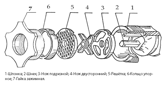 В комплект поставки входит подрезная решетка, двусторонний нож, 2 решетки (№2 и № 3), насадка для колбас и толкатель.