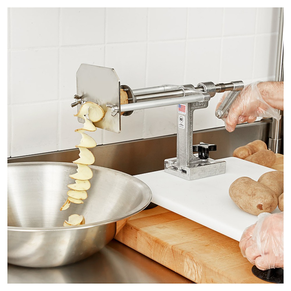 Картофелерезка Nemco 55050AN-WCT предназначена для нарезки целого картофеля в кожуре на спиральные волнистые чипсы на предприятиях общественного питания и торговли. Модель оснащена гладким валом и монтируется на любую плоскую поверхность. Принцип действия: установить чистый картофель и вращать ручку, одновременно равномерно надавливая для продвижения картофеля вперёд. Корпус выполнен из литого алюминия и нержавеющей стали.
