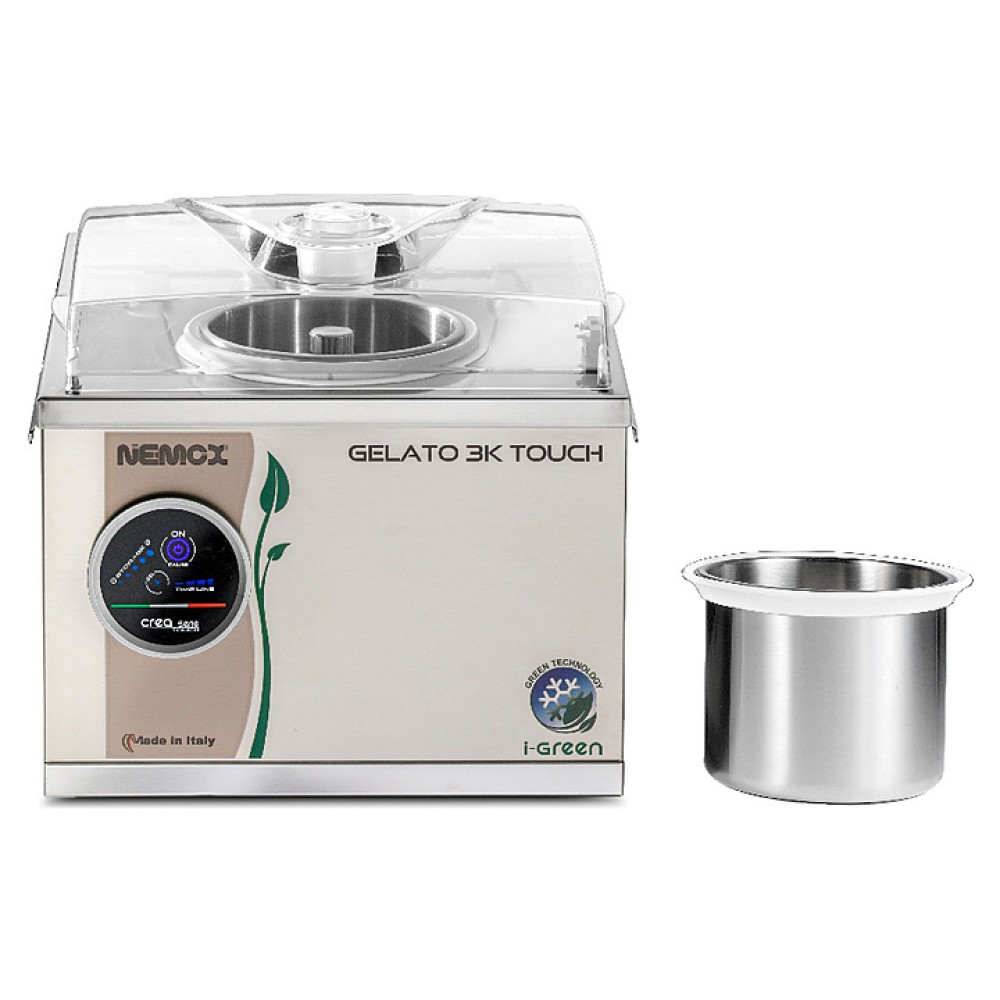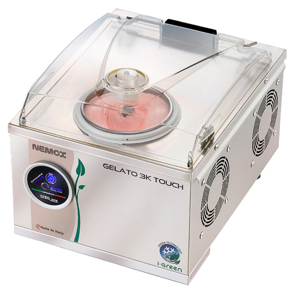 Фризер для мороженого Nemox i-Green Gelato 3K Touch используется в барах, кафе, на открытых летних площадках, в специальных отделах супермаркетов и торговых центрах для приготовления мороженого кремообразной текстуры. Модель оснащена индукционным двигателем, фиксированной и съемной емкостями, крышкой с отверстием для добавления ингредиентов и датчиком, блокирующим вращение лопасти при ее подъеме. Корпус, емкости и лопасть для перемешивания выполнены из нержавеющей стали.
