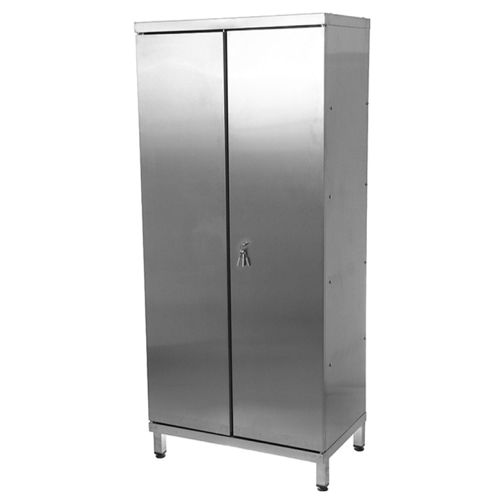Кухонный шкаф ЦМИ Профи ШПДР4-120/50/180 используется на предприятиях общественного питания и торговли для хранения столовой и кухонной посуды и инвентаря, а также продуктов питания, не требующих особых условий хранения. Модель оснащена распашными дверьми с замком и ручками. Изделие выполнено из нержавеющей стали AISI 430 толщиной 0,8 мм, основание - из нержавеющей трубы AISI 430 40х40х1,2 мм.