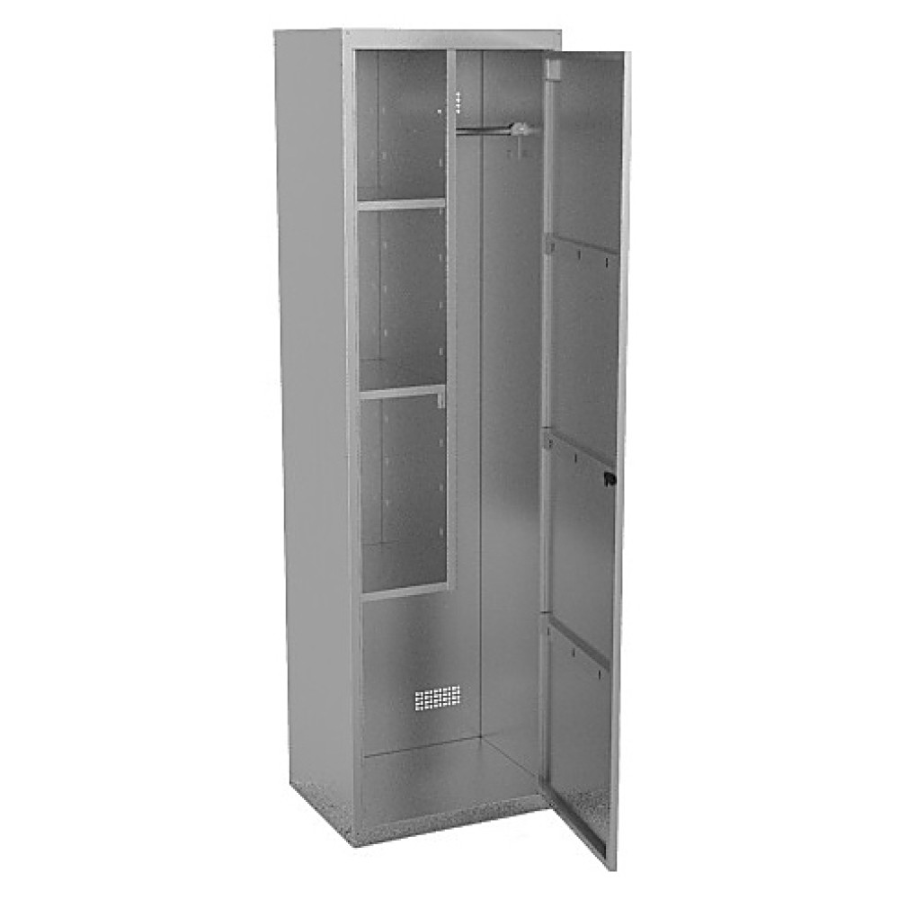 Кухонный шкаф Кобор ШХ-60/50 используется на предприятиях общественного питания и торговли для хранения хозинвентаря. Модель оснащена дверью с замком, 3 полками, 2 из которых регулируются по высоте, перекладиной и 2 крючками. Каркас выполнен из нержавеющей стали AISI 430.
