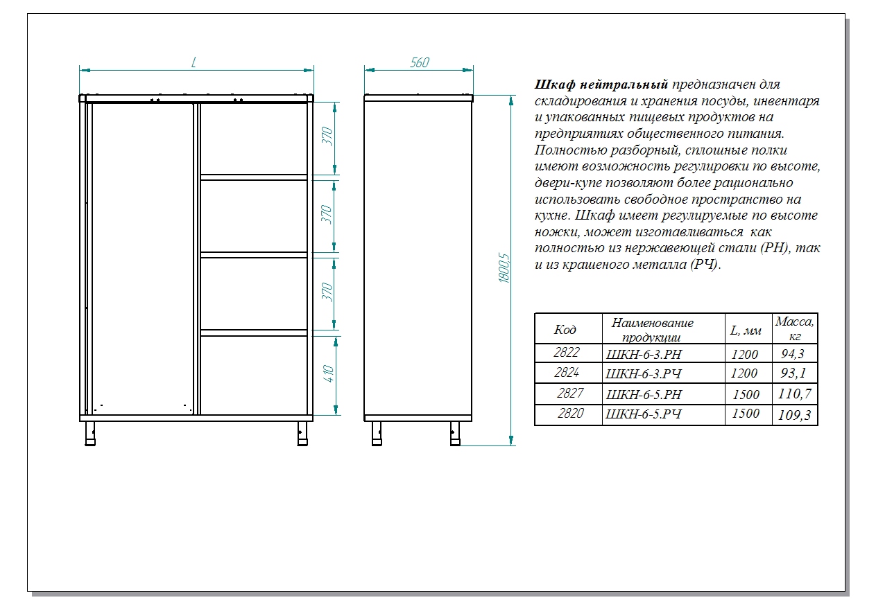 Кухонный шкаф Abat ШКН-6-5 РН предназначен для хранения посуды, кухонных принадлежностей и продуктов, не требующих специального температурного режима на предприятиях общественного питания и торговли. Модель оснащена регулируемыми по высоте полками и ножками.