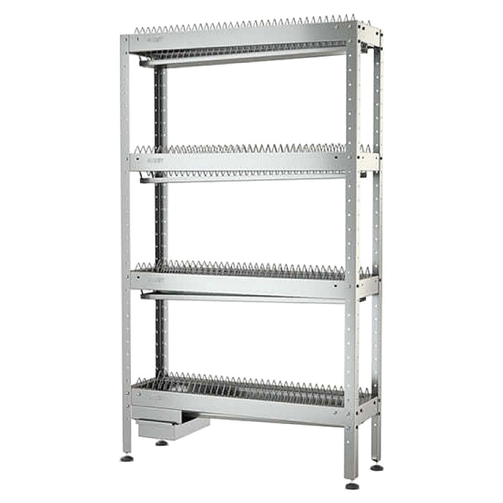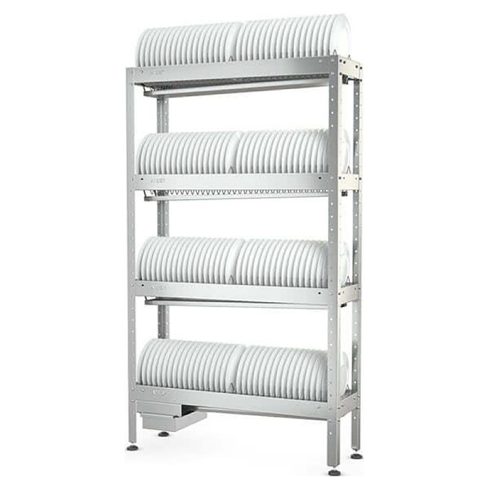 Стеллаж ATESY СКТ-С-950-02-Н серии Стандарт предназначен для хранения тарелок на предприятиях общественного питания и торговли. Полки выполнены из нержавеющей стали AISI 430 толщиной 0,8 мм, каркас - из оцинкованной стали толщиной 1,2 мм, сетки - из прутка из нержавеющей стали AISI 304, ножки - из нержавеющей стали, опора ножек - из пластика.