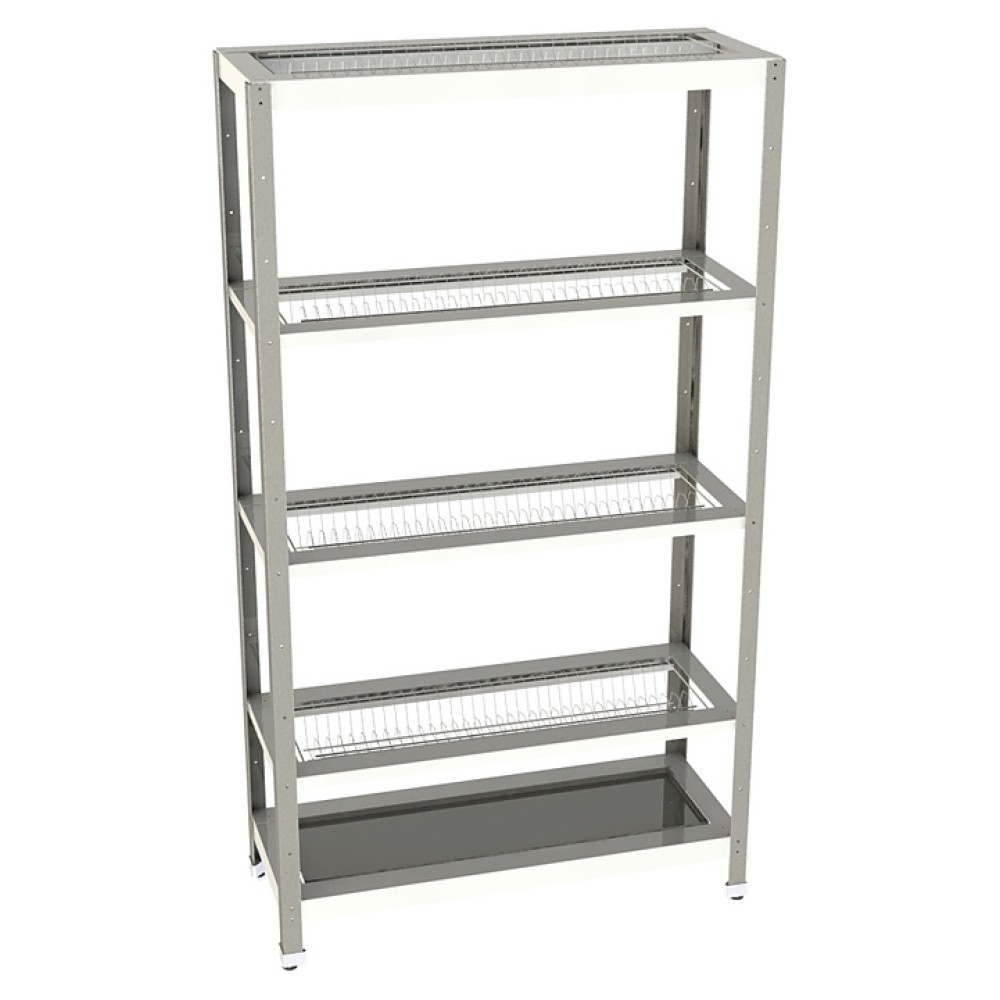Стеллаж Restoinox СТПТС-10/4-ЭН предназначен для сушки и хранения тарелок и стаканов на предприятиях общественного питания и торговли. Модель оснащена 2 решетчатыми полками для тарелок, 2 решетчатыми полками для стаканов, поддоном для сбора влаги и регулируемыми по высоте пластиковыми опорами. Разборный каркас выполнен из уголка нержавеющей стали AISI 430, полки и поддон - из нержавеющей стали AISI 430.