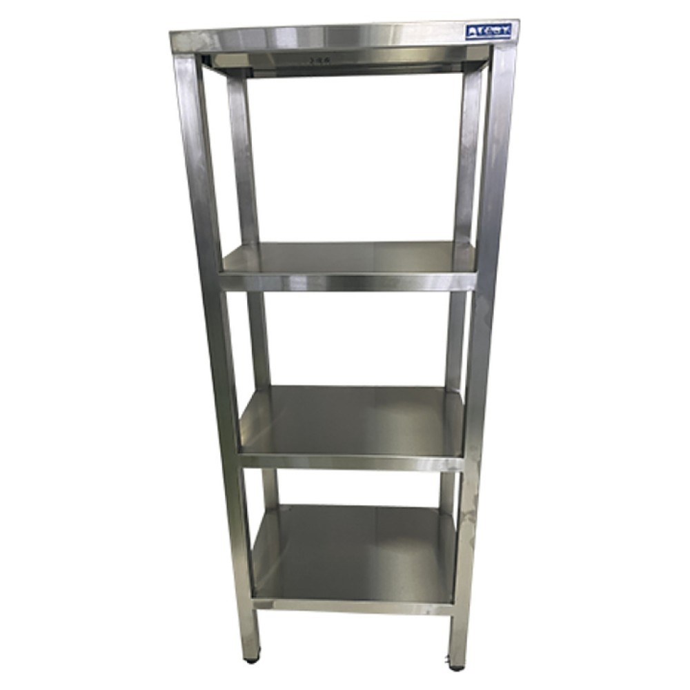 Кухонный стеллаж ATESY СТК-Л-600.500.1800-02-Н серии Люкс предназначен для хранения кухонного инвентаря, посуды и упакованных пищевых продуктов на предприятиях общественного питания и торговли в моечных отделениях, холодных, горячих цехах и других производственных помещениях. Модель состоит из 4 стоек и 4 полок. Стойки стеллажа изготовлены из нержавеющей стали AISI 430 с квадратным сечением 40х40 мм, полки - из пищевой нержавеющей стали AISI 430, опоры ножек - из пластика.