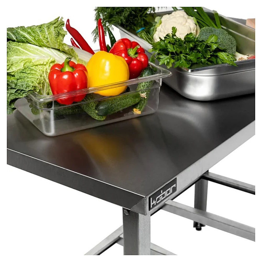 Столешница стола Kобор СР-150/70 произведена из высококачественной нержавеющей стали, а также для увеличения прочности и во избежании прогибания укреплена ЛДСП толщиной 16 мм. Ножки стола регулируются по высоте, что помогает избежать наклона рабочей поверхности стола. Каркас стола выполнен из оцинкованного уголка. Товар поставляется в разобранном виде и в упаковке для облегчения транспортировки.