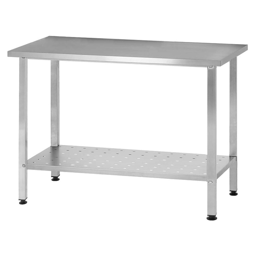Производственный стол Mecon Norma Inox СПРн предназначен для разделывания и обработки пищевых продуктов, а также в качестве вспомогательной поверхности для кухонного оборудования на предприятиях пищевой промышленности, общественного питания и торговли. Модель оснащена усиленной перфорированной полкой и регулируемыми по высоте полиамидными опорами. Ножки выполнены из профильной трубы 40х40 мм нержавеющей стали с базирующими пуклевками, столешница - из шлифованной пищевой нержавеющей стали AISI 430 с усилением подложкой из ЛДСП, полка - из нержавеющей стали.