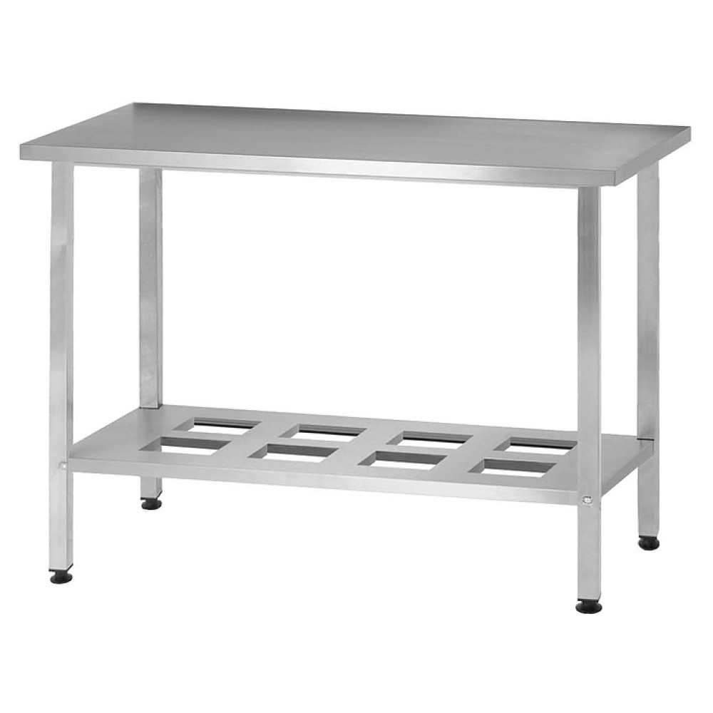 Производственный стол Mecon Norma Ral СПРн предназначен для разделывания и обработки пищевых продуктов, а также в качестве вспомогательной поверхности для кухонного оборудования на предприятиях пищевой промышленности, общественного питания и торговли. Модель оснащена усиленной полкой-решеткой и регулируемыми по высоте полиамидными опорами. Ножки выполнены из профильной трубы 40х40 мм с полимерно-порошковым покрытием с базирующими пуклевками, столешница - из шлифованной пищевой нержавеющей стали AISI 430 с усилением подложкой из ЛДСП, полка - из стали с полимерно-порошковым покрытием.