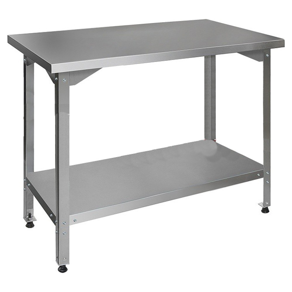 Стол производственный Finist СПН 1200х700х850 мм серии Нормал предназначен для обработки различных продуктов и раскатки теста, а также хранения кухонной утвари на предприятиях общественного питания, в пекарнях, кондитерских и гипермаркетах. Модель оснащена пазами в ножках для регулирования уровня полки. Разборный каркас выполнен из нержавеющей стали, столешница- из шлифованной нержавеющей стали.