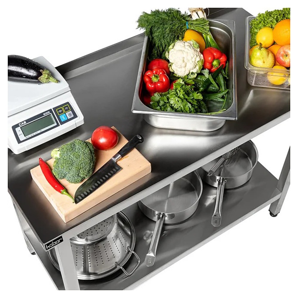 Столешница стола Koбор СПБ-60/60 используется на предприятиях общественного питания и торговли для разделывания и обработки пищевых продуктов, а также в качестве вспомогательной поверхности для кухонного оборудования. Каркас выполнен из квадратной трубы 40х40 мм нержавеющей стали, столешница и полка - из нержавеющей стали AISI 430, столешница укреплена листом ламинированной древесностружечной плиты с внутренней стороны.