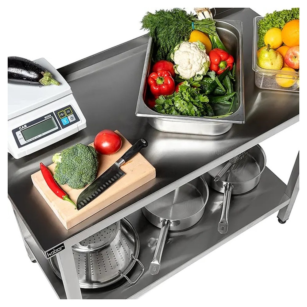 Производственный стол Кобор СПРБ-110/60/П предназначен для обработки продуктов питания и хранения кухонного инвентаря на предприятиях общественного питания и торговли. Разборный каркас выполнен из нержавеющей квадратной трубы 40х40 мм, столешница - из нержавеющей стали AISI 430 с усилением из ЛДСП.