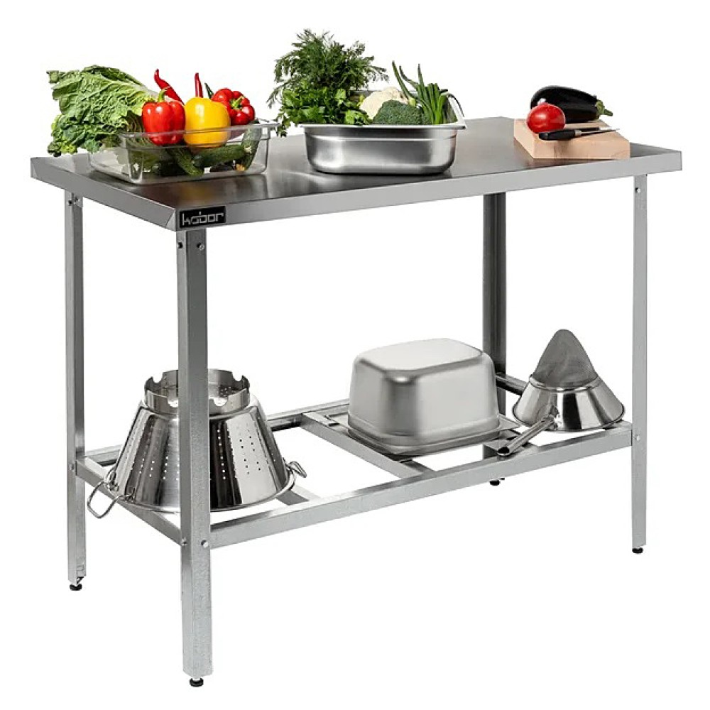 Столешница стола Kобор СР-60/60 произведена из высококачественной нержавеющей стали, а также для увеличения прочности и во избежании прогибания укреплена ЛДСП толщиной 16 мм. Ножки стола регулируются по высоте, что помогает избежать наклона рабочей поверхности стола. Каркас стола выполнен из оцинкованного уголка. Товар поставляется в разобранном виде и в упаковке для облегчения транспортировки.
