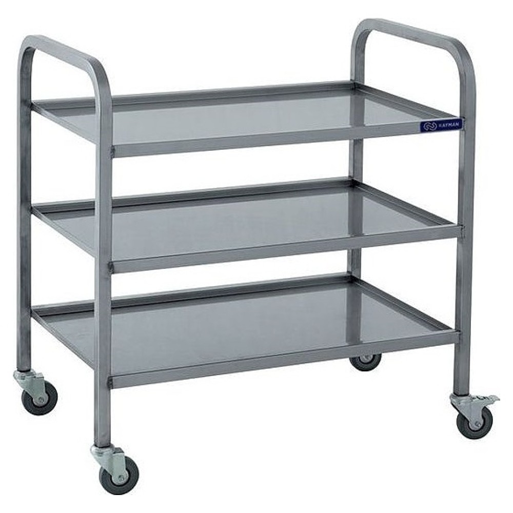 Сервировочная тележка KAYMAN ТС-13/390-А используется на предприятиях общественного питания для транспортировки готовых блюд, напитков и посуды в зал приема пищи, а также грязной посуды из зала в моечное отделение. Модель оснащена 3 сплошными полками с герметичными бортиками. Полки выполнены из листовой нержавеющей стали марки AISI 304, каркас – из профиля трубы квадратного сечения из нержавеющей стали марки AISI 304.