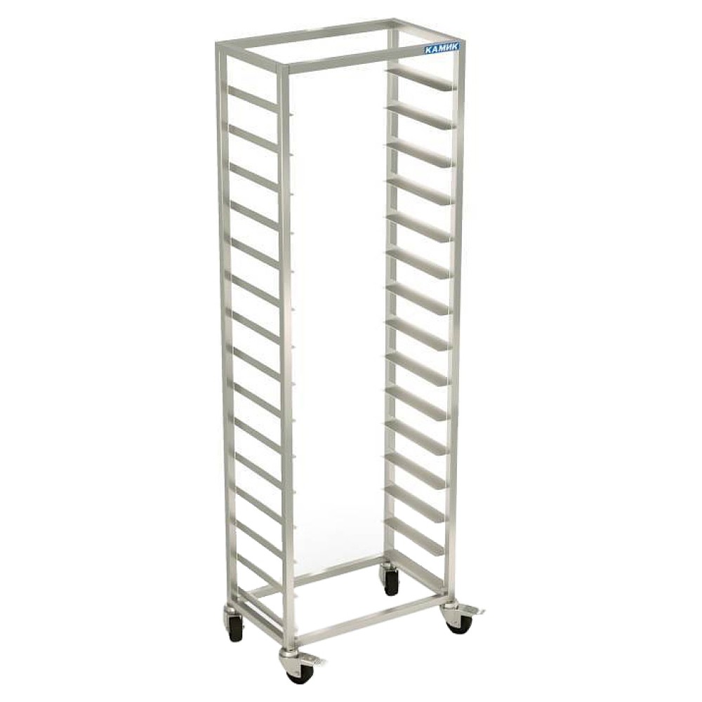 Тележка-шпилька КАМИК Шп-415221 предназначена для временного хранения и транспортировки гастроемкостей с полуфабрикатами и готовой продукцией в столовых, барах, ресторанах и на других предприятиях общественного питания и торговли. Модель оснащена 4 маневренными поворотными роликами. Корпус и направляющие выполнены из профиля высококачественной нержавеющей стали AISI 430.