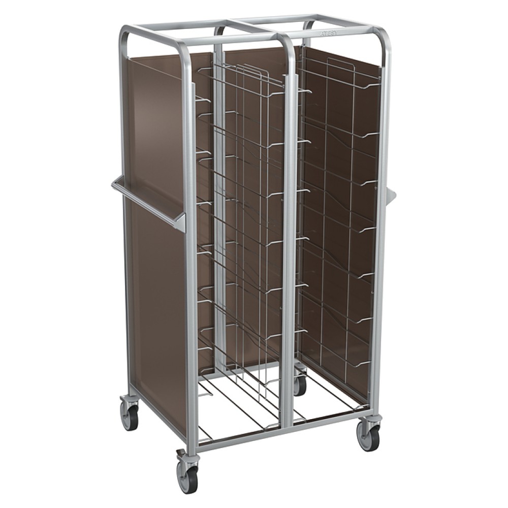Тележка-шпилька ATESY КШП-Л-2.8-330.600-02-ОК серии Люкс используется на предприятиях общественного питания и торговли для транспортировки и хранения подносов. Модель оснащена 4 поворотными колесами, 2 из которых снабжены тормозными устройствами. Сварная конструкция полностью выполнена из нержавеющей стали AISI 304.
