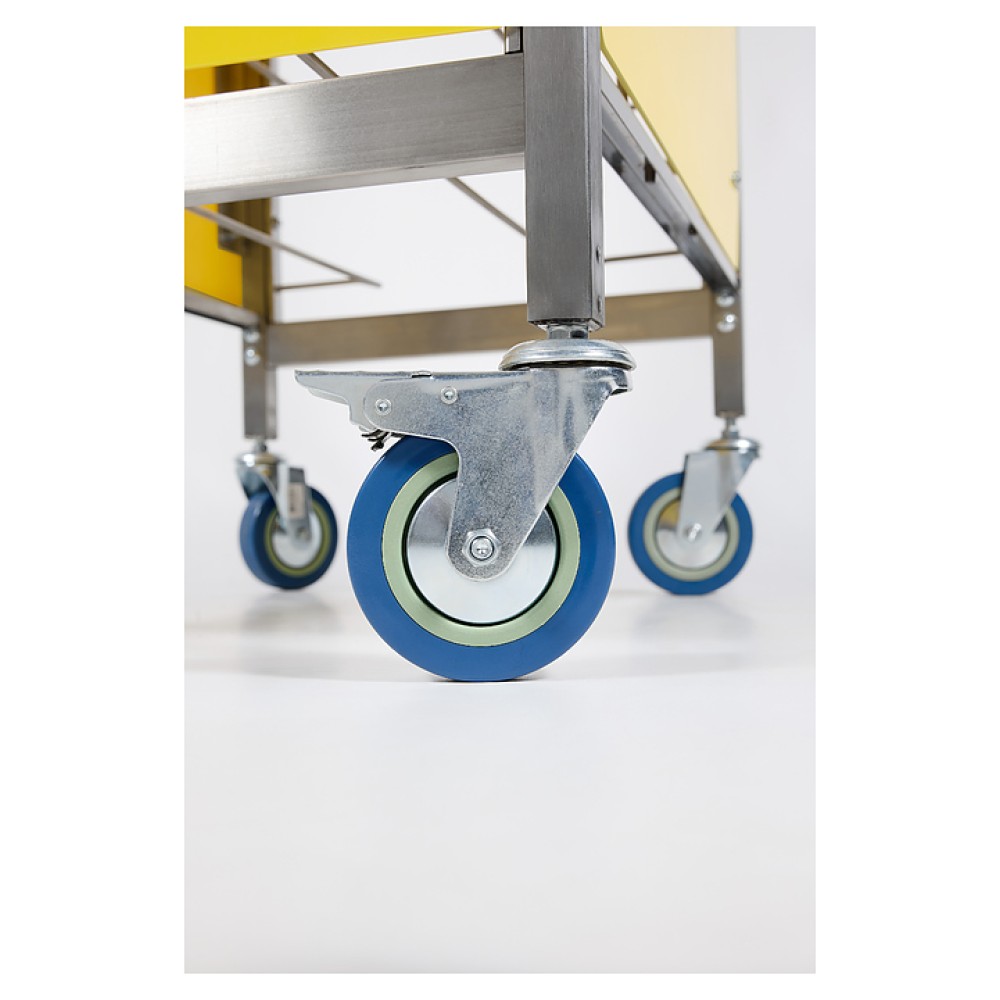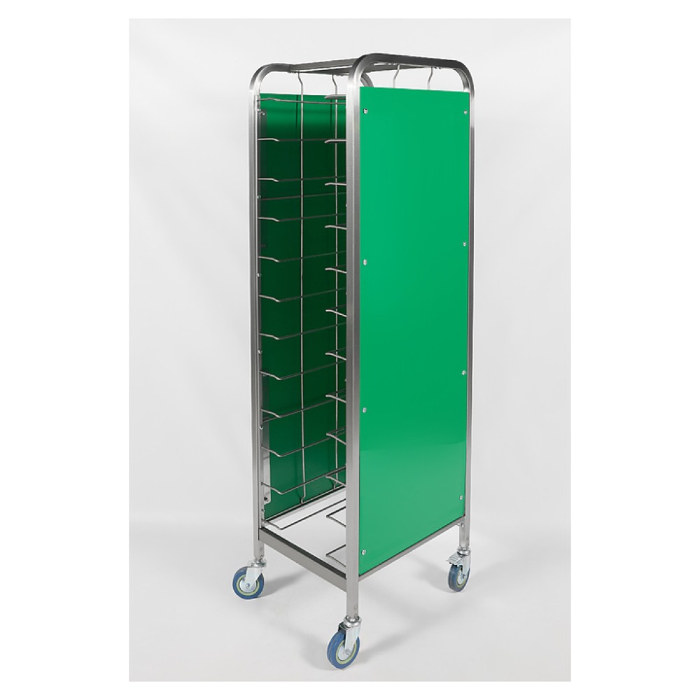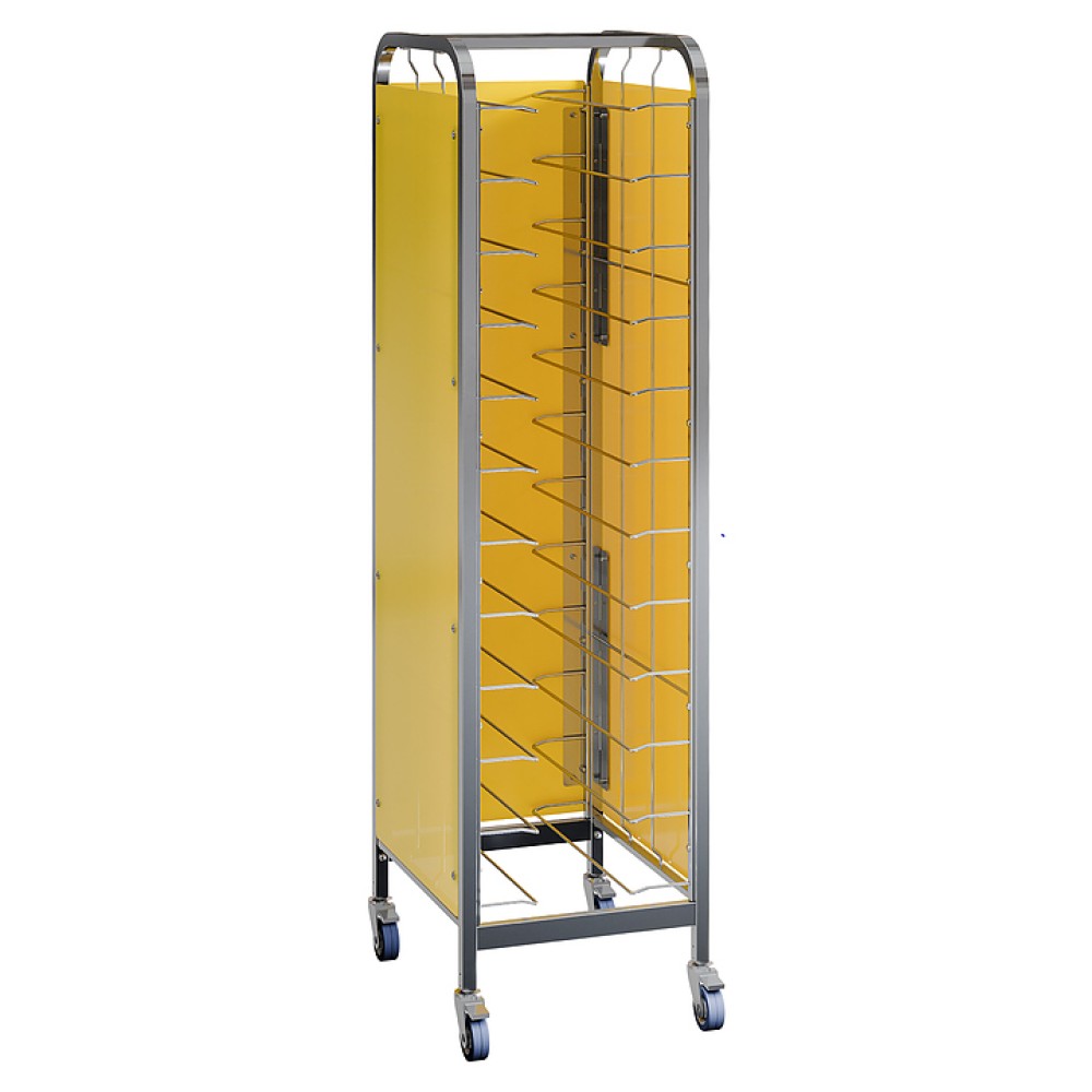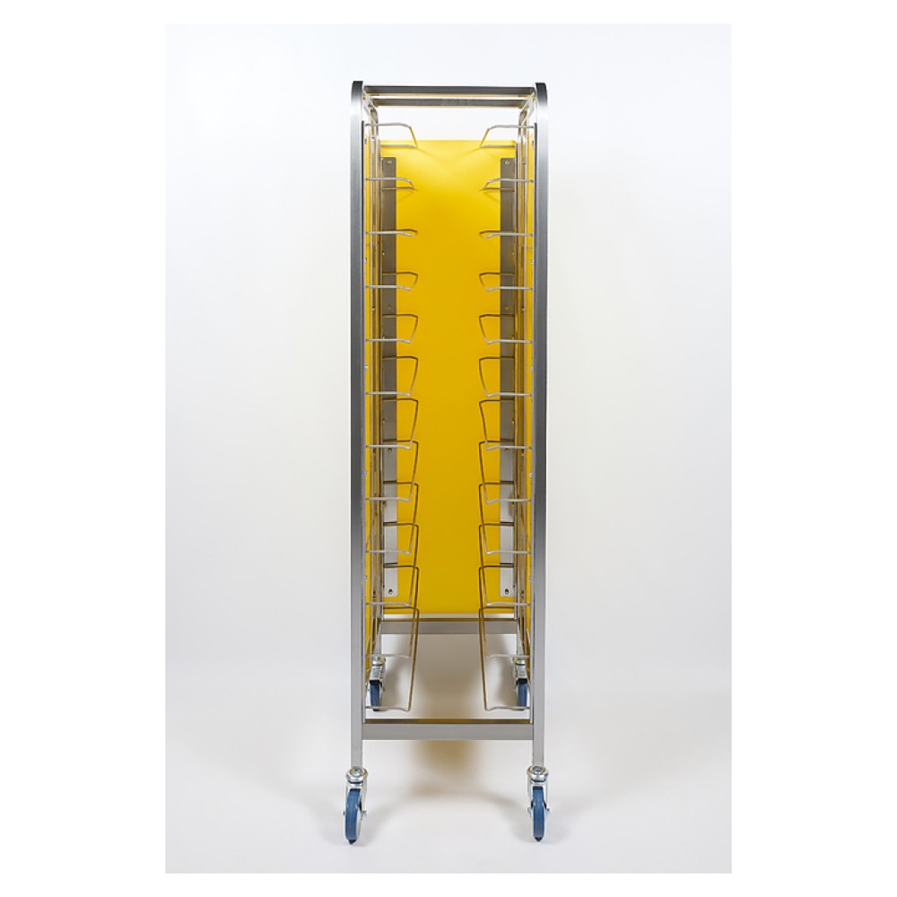 Тележка-шпилька Restoinox ТШРЗППР-12/360/540 предназначена для хранения и транспортировки подносов на предприятиях общественного питания и торговли. Модель оснащена 4 колесами, 2 из которых со стопорами. Разборный каркас выполнен из трубы 25х25 мм нержавеющей стали AISI 430, боковины - из цветного пластика.