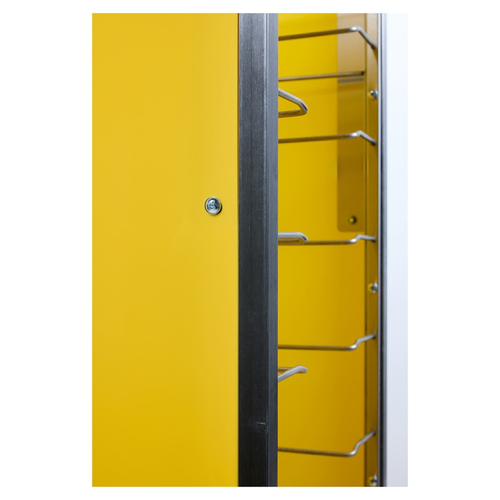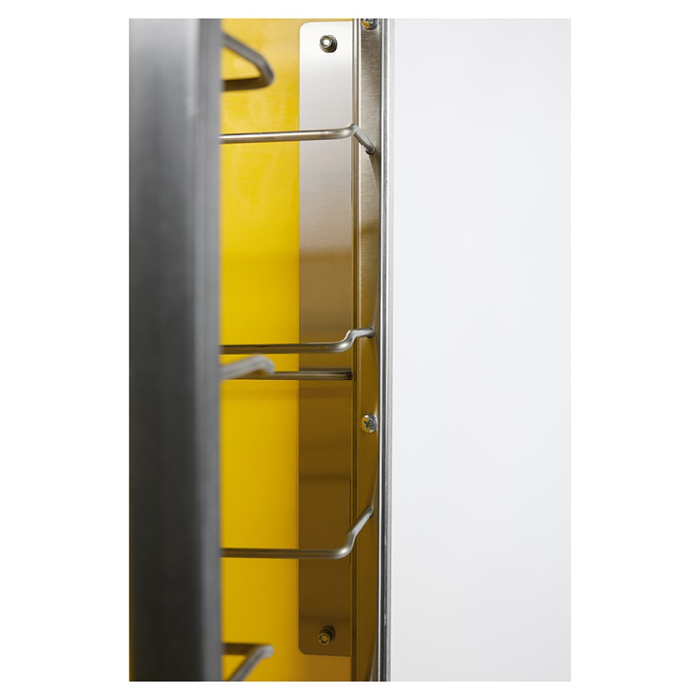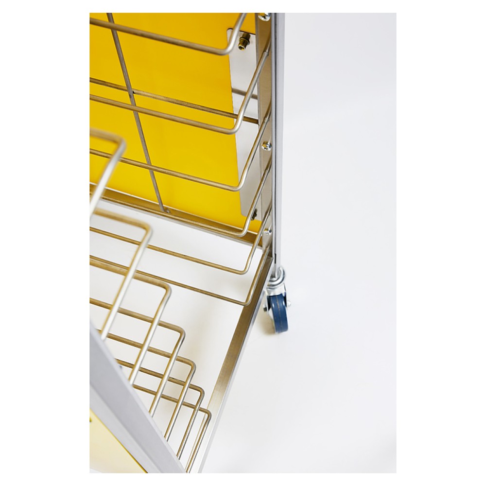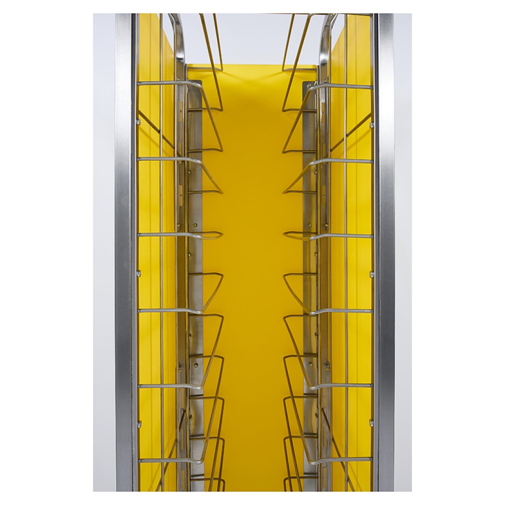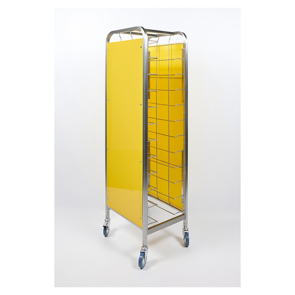 Тележка-шпилька Restoinox ТШРЗППР-12/360/540 предназначена для хранения и транспортировки подносов на предприятиях общественного питания и торговли. Модель оснащена 4 колесами, 2 из которых со стопорами. Разборный каркас выполнен из трубы 25х25 мм нержавеющей стали AISI 430, боковины - из цветного пластика.