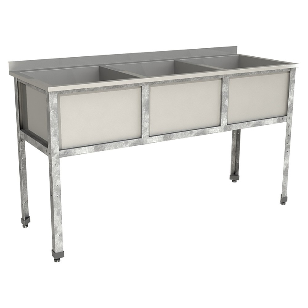 Моечная ванна Restoinox ВМС-3/4-Б-ЭЦ используется на предприятиях общественного питания и торговли для мытья посуды, кухонного инвентаря и продуктов. Модель оснащена площадкой под смеситель с бортом. Каркас выполнен из уголка 40х40 мм оцинкованной стали, емкость - из нержавеющей стали AISI 430.