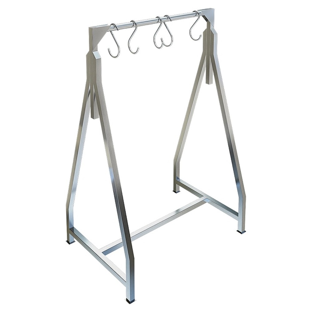 Вешало Техно-ТТ СТС-931/1000 предназначено для подвешивания мясных туш с целью замораживания, дефростации на предприятиях пищевой промышленности, общественного питания и торговли. Модель состоит из боковин треугольной формы, узла подвеса, усиливающих продольной и поперечных нижних перекладин и подпятниками для крепления к полу. Сварной каркас выполнен из профиля трубы квадратного сечения из нержавеющей стали марки AISI304, перекладина подвеса – из профиля трубы круглого сечения. Изделие поставляется в собранном виде.