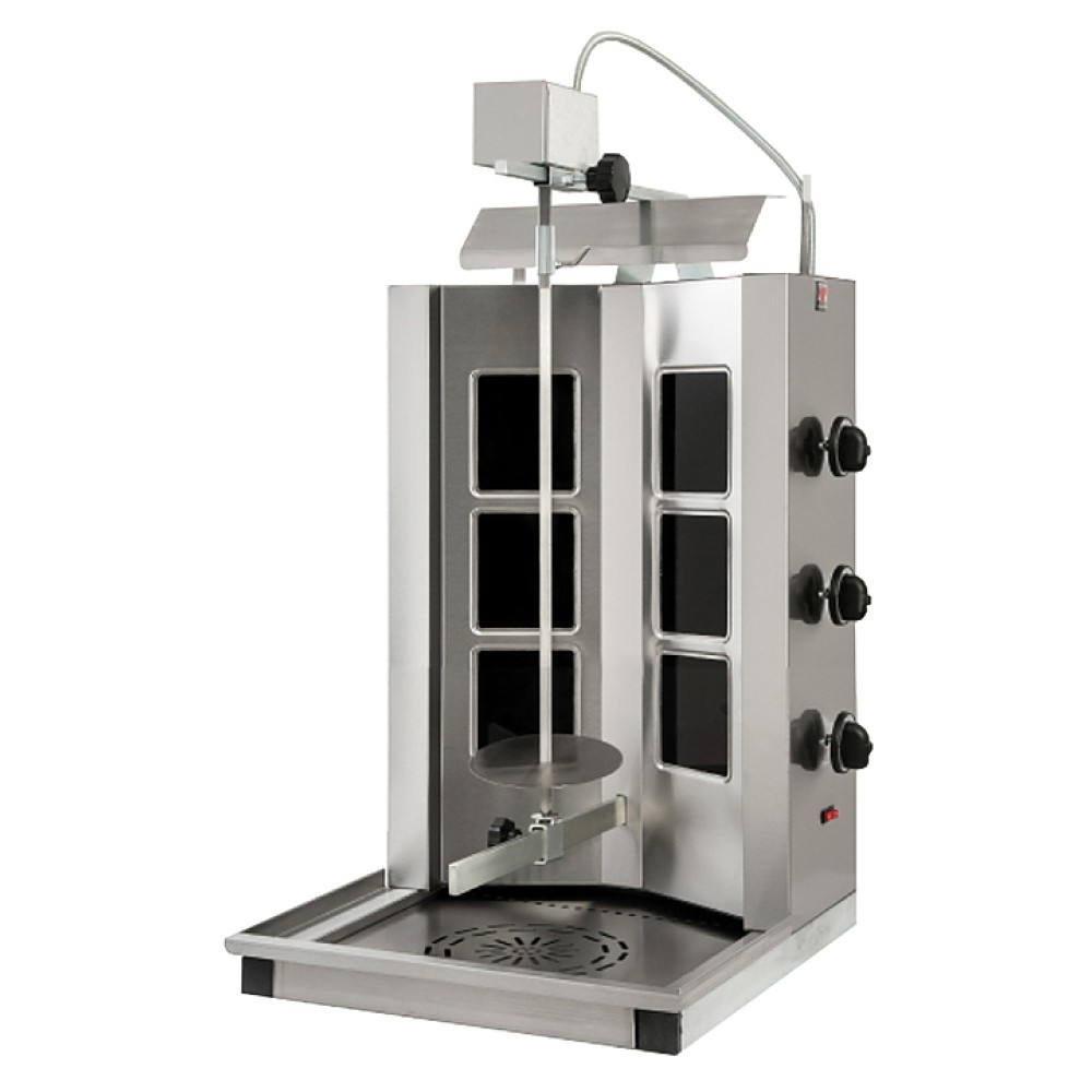 Гриль для шаурмы North DKE6 используется на предприятиях общественного питания и торговли для приготовления жаренного рубленного мяса. Модель оснащена верхним электрическим двигателем для автоматического вращения спицы и круглым основанием с дренажной поверхностью. Корпус выполнен из нержавеющей стали AISI 304, нагревательные элементы - из стеклокерамики.