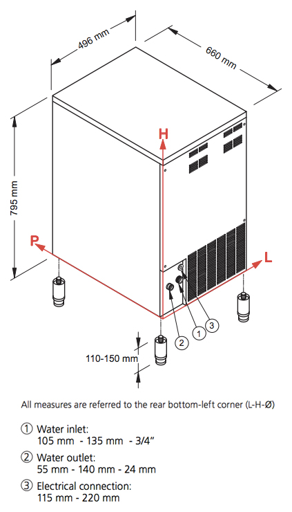 Льдогенератор NTF SLF 225 A используется в магазинах, косметических салонах, больницах, гостиницах, производствах, ресторанах, кафе и барах для приготовления гранулированного льда, который применяется для выкладки и охлаждения разных видов продуктов и медикаментов. Для монтажа льдогенератора необходимы подводка (вентиль 3/4″) и отвод холодной воды (сток Ø 24 мм). Корпус изготовлен из нержавеющей стали AISI 304 с отделкой Scotch Brite, ножки - из нержавеющей стали, испаритель - из нержавеющей стали AISI 304, шнек - из нержавеющей стали AISI 303.