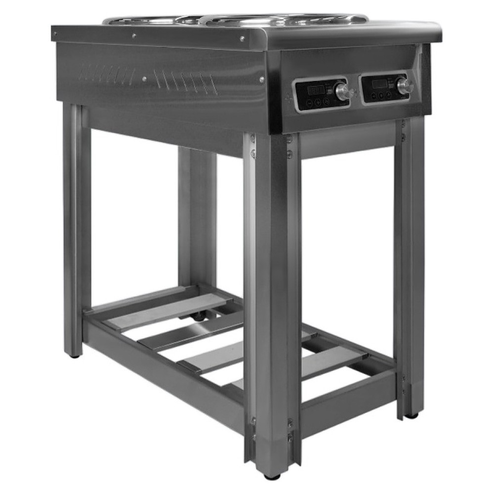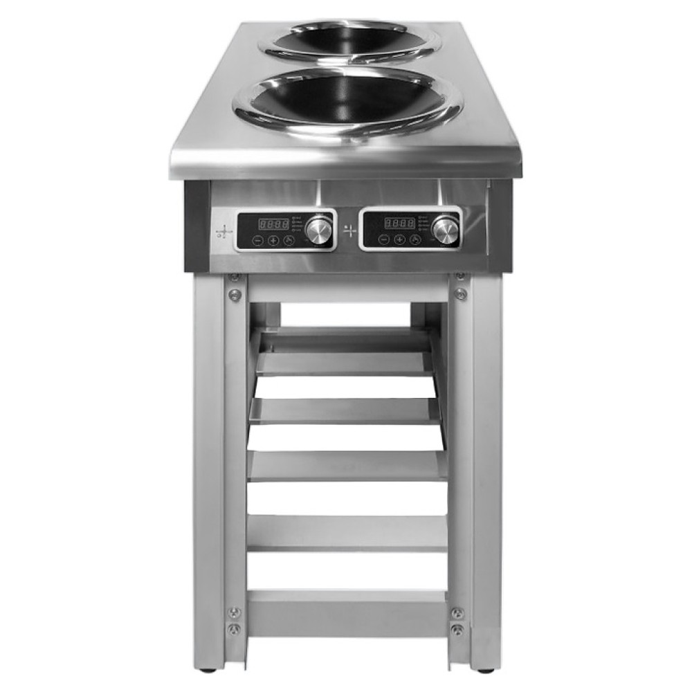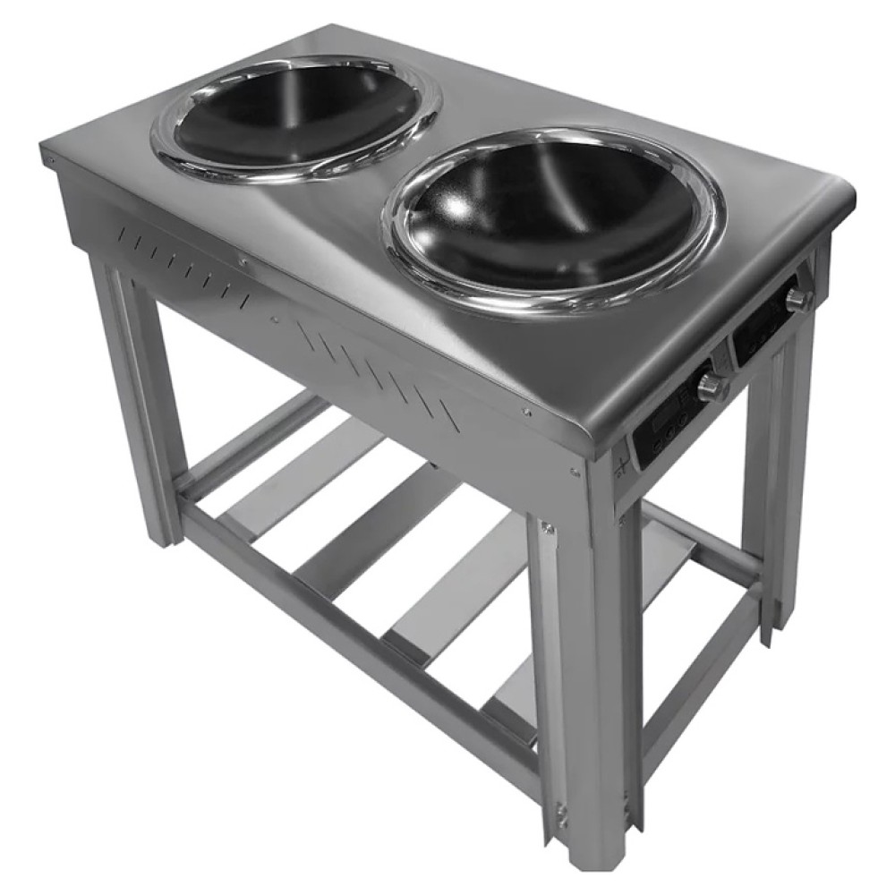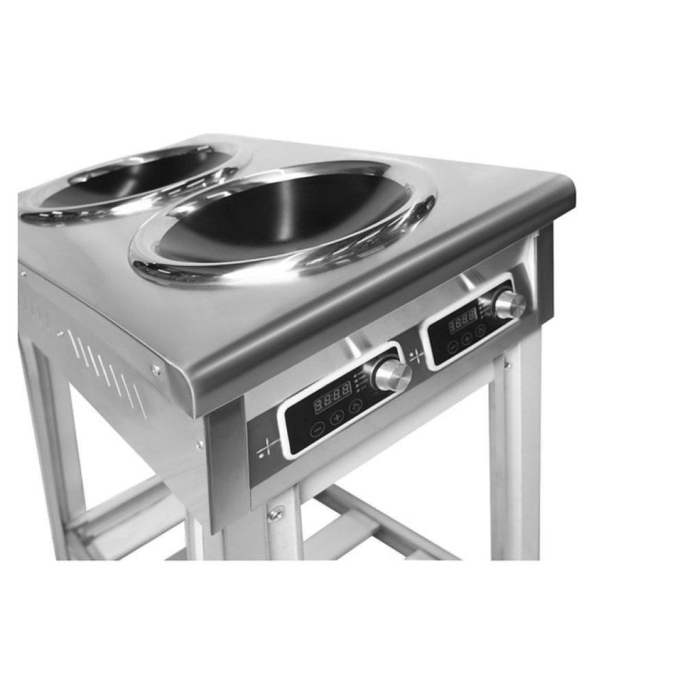 Индукционная плита OBOD WOK предназначена для приготовления большого ассортимента блюд на предприятиях пищевой промышленности, общественного питания и торговли. Принцип работы основан на непосредственном нагреве металлической посуды создаваемыми высокочастотным магнитным полем индуцированными вихревыми токами. Модель оснащена 2 независимыми варочными зонами в виде полусферических чаш с выпуклой кромкой, открытой подставкой и расположенной на наклонной фронтальной стенке электромеханической панелью управления. Корпус выполнен из нержавеющей стали.