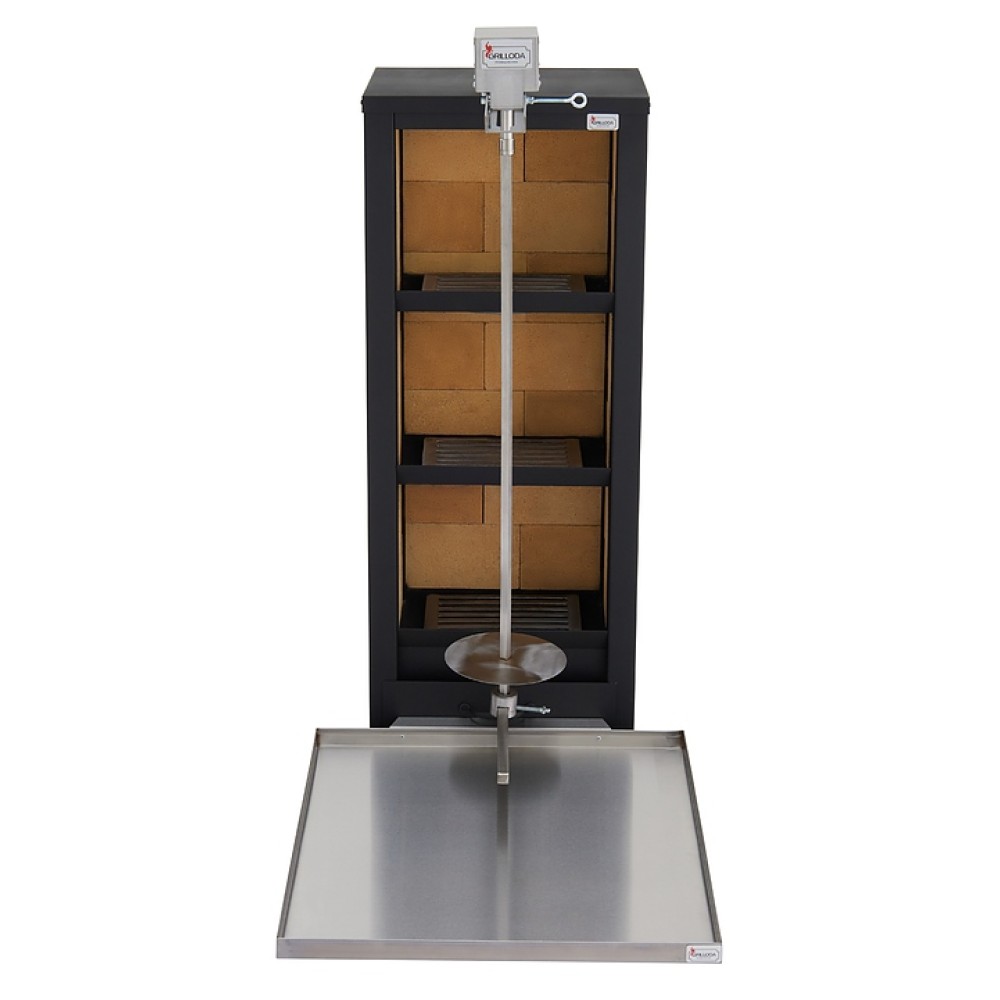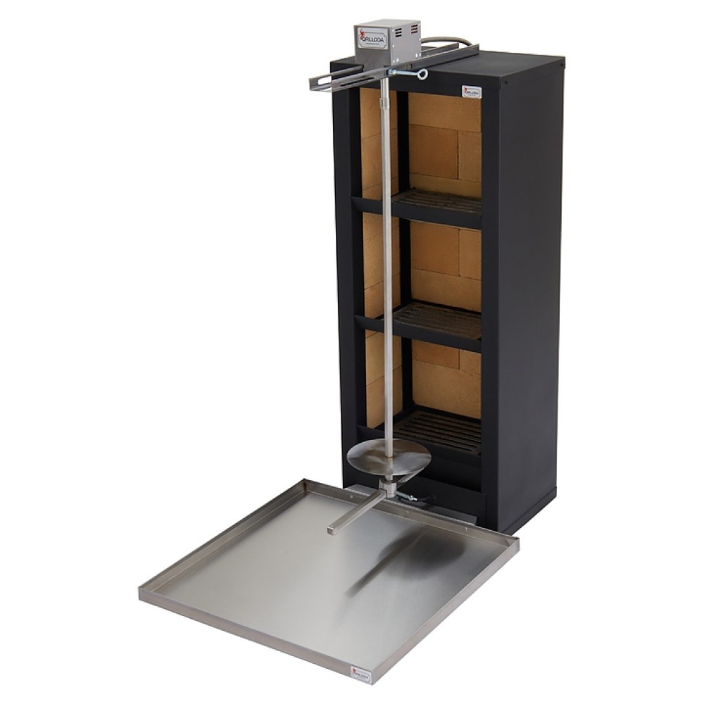 Универсальный вертикальный угольный аппарат GRILLODA ШУМ-3 предназначен для приготовления шаурмы и шашлыка с использованием углей на предприятиях общественного питания и торговли. Корпус выполнен из жаропрочной антикоррозийной стали, покрытой термостойкой краской, выдерживающей нагрев до 1200 °С, внутренняя отделка - из огнеупорного шамотного кирпича, шампур и поднос - из нержавеющей стали.