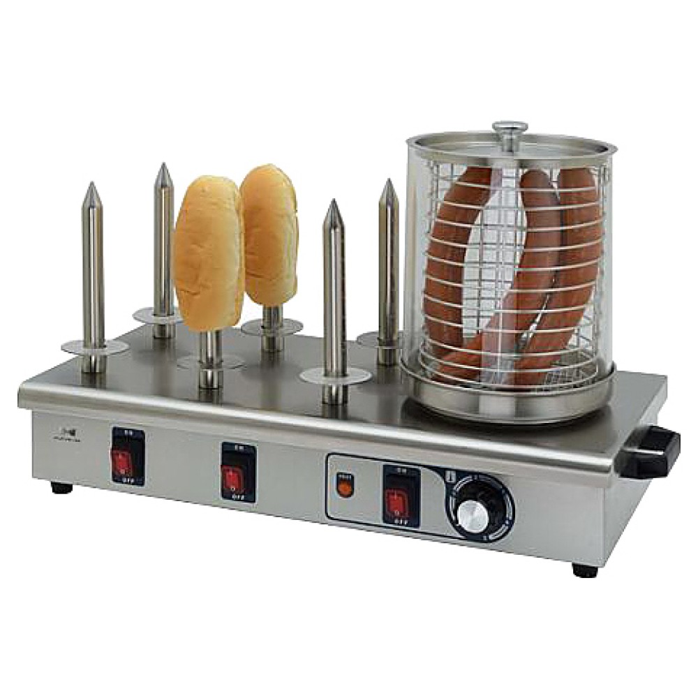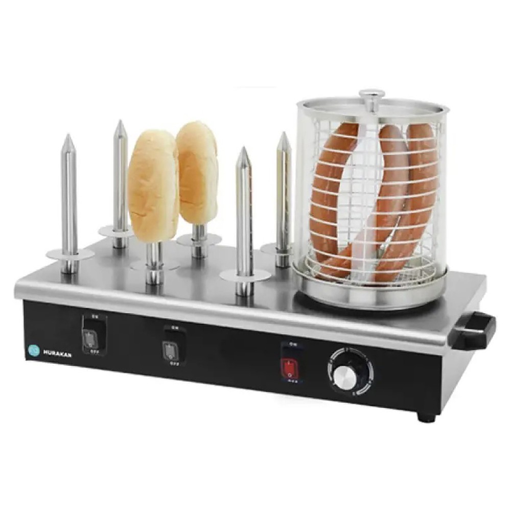 Аппарат для хот-догов Hurakan HKN-Y06 используется на предприятиях общественного питания и торговли для отваривания и хранения в горячем виде сосисок и подогрева булочек. Модель оснащена регулятором температуры, раздельным нагревом колбы и штырей, паровой баней и 6 нагреваемыми штырями. Корпус выполнен из нержавеющей стали и крашенного металла, штыри - из нержавеющей стали, колба - из стекла.