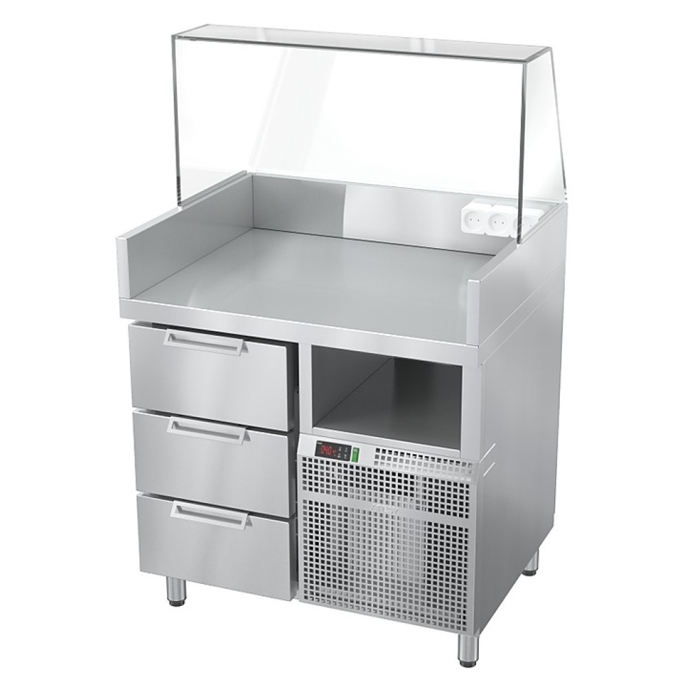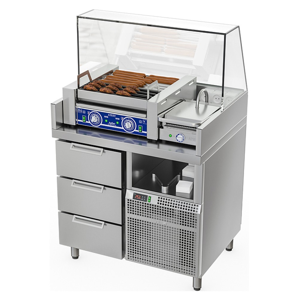 Станция ATESY Бавария БХС - 900.700-02 предназначена для комплексного оснащения рабочего места приготовления и продажи хот-догов и бургеров, а также для хранения предварительно охлажденных мясных полуфабрикатов, хлебобулочных изделий, начинок и соусов на предприятиях общественного питания и торговли. Модель оснащена встроенным контроллером управления температурным режимом станции с возможностью программирования и нейтральной нишей для хранения инвентаря: щипцов, салфеток, одноразовой посуды. Все конструктивные элементы станции, контактирующие с продуктами питания, выполнены из нержавеющей стали.