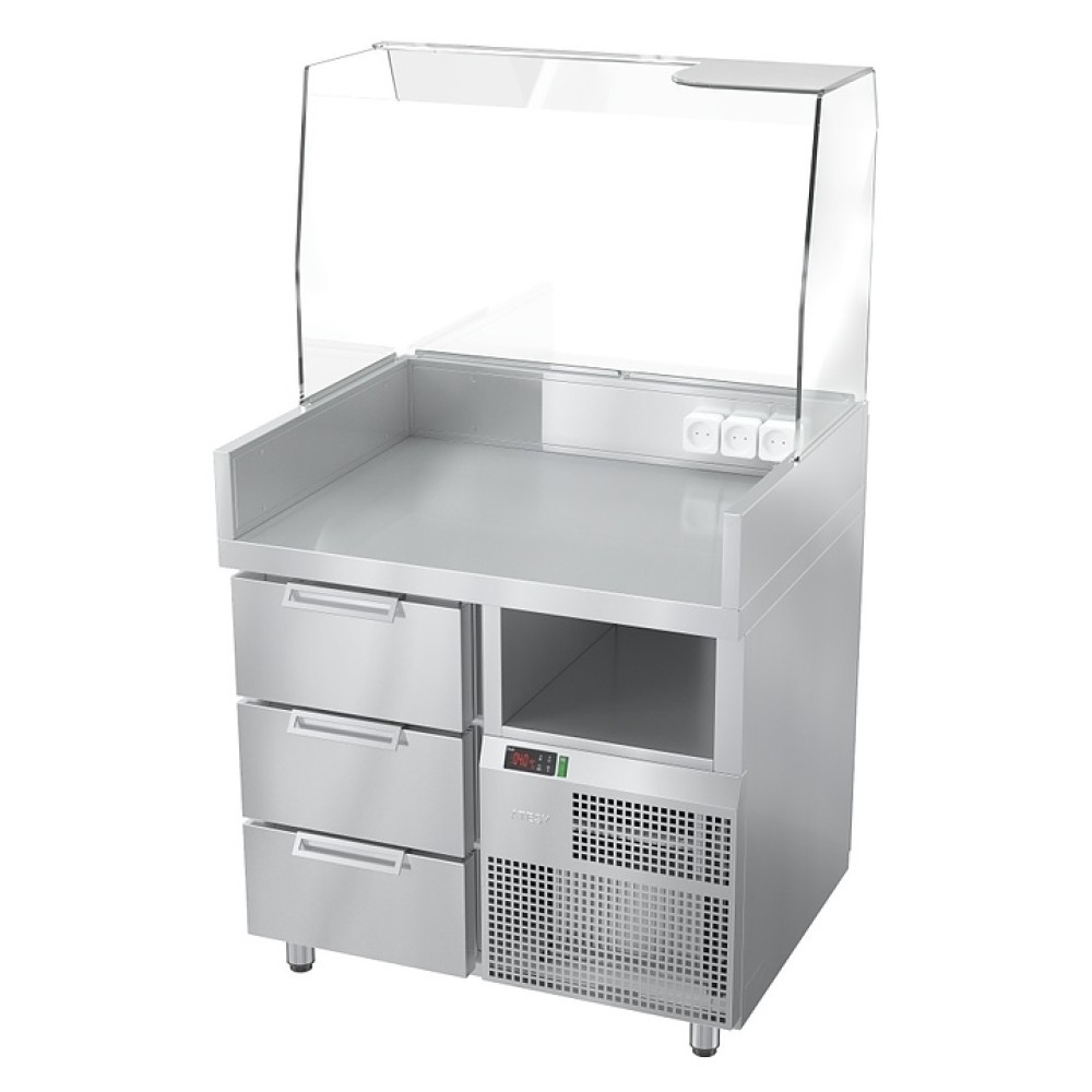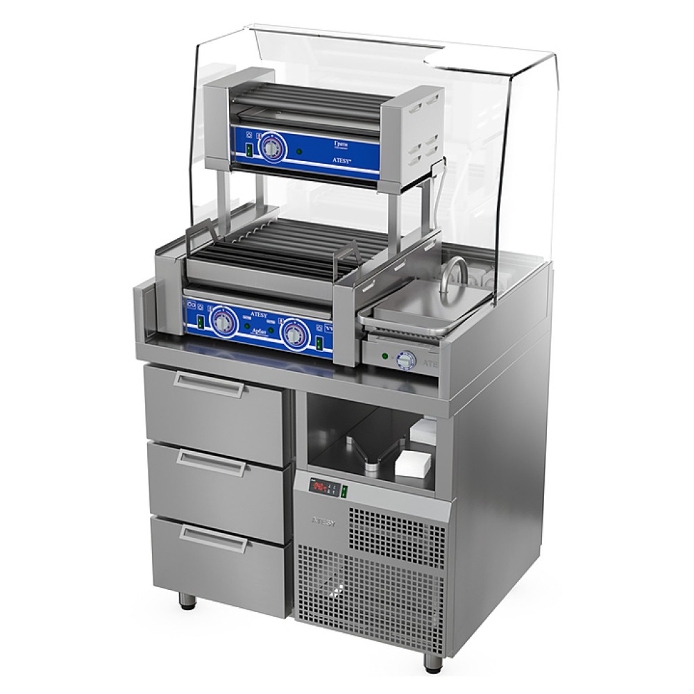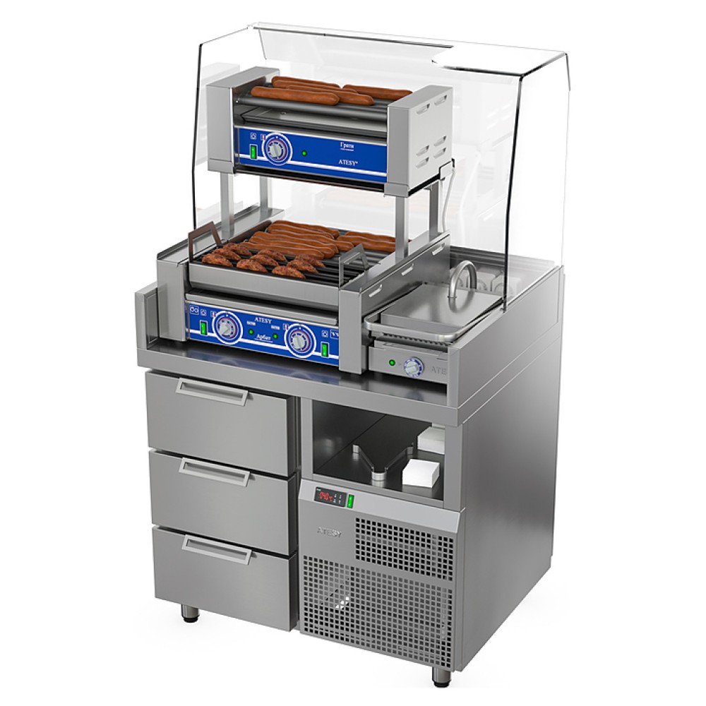 Станция ATESY Бавария БХС - 900.700-02 плюс предназначена для комплексного оснащения рабочего места приготовления и продажи хот-догов и бургеров, а также для хранения предварительно охлажденных мясных полуфабрикатов, хлебобулочных изделий, начинок и соусов на предприятиях общественного питания и торговли. Модель оснащена встроенным контроллером управления температурным режимом станции с возможностью программирования и нейтральной нишей для хранения инвентаря: щипцов, салфеток, одноразовой посуды. Все конструктивные элементы станции, контактирующие с продуктами питания, выполнены из нержавеющей стали.